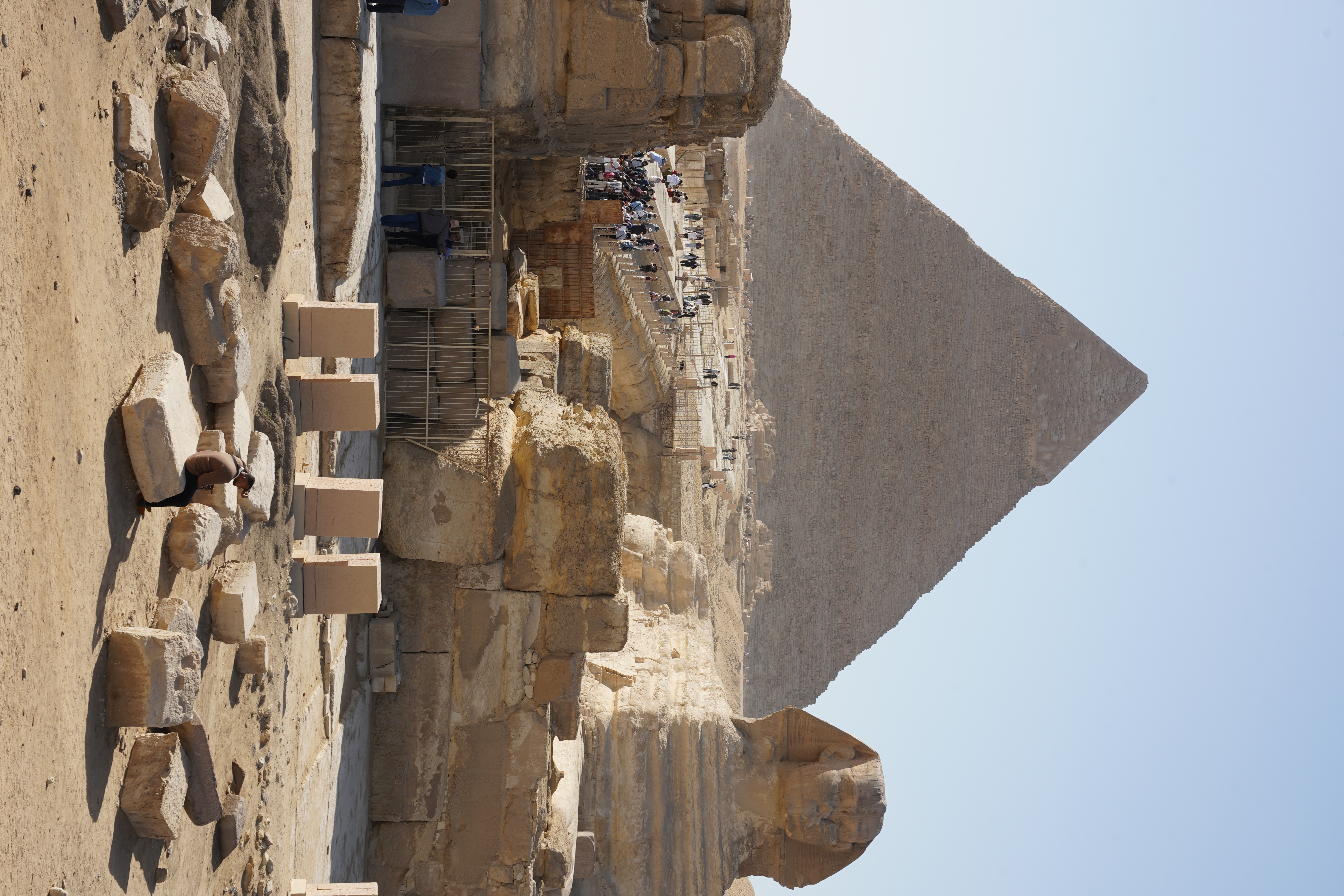 在金字塔群的东侧,矗立着一座巨大的狮身人面像,它由一整块巨石雕刻而成,高达20米,长57米,面部是法老哈夫拉的面容,身体则是狮子的形态,象征着法老的威严与力量。狮身人面像的鼻子已经缺失,相传是被拿破仑的军队破坏,也有说法是被当地民众破坏,如今依旧静静地守护在金字塔前,见证着岁月的变迁。