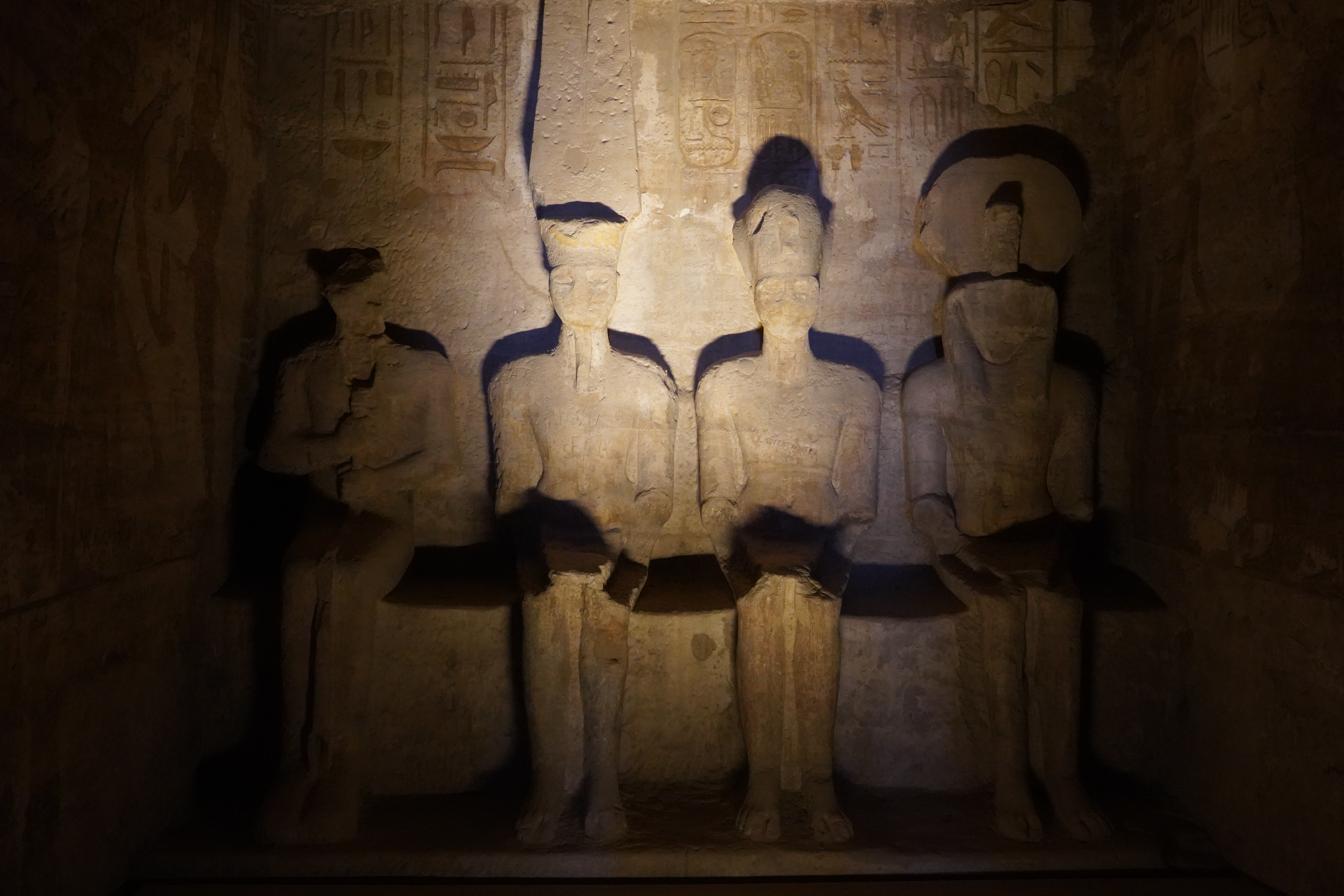 更令人惊叹的是阿布辛贝神庙的太阳节奇观,每年2月21日(拉美西斯二世生日)和10月21日(拉美西斯二世加冕日)清晨,阳光会穿透60米长的甬道,精准照亮圣殿深处的阿蒙·拉、拉美西斯二世、拉霍拉克提三神像,唯独黑暗之神普塔永驻阴影,这一奇观是古埃及人智慧的结晶,展现了他们对天文历法的精准掌握。虽然我们没有赶上太阳节,但站在神庙内,依旧能感受到这份神迹的神奇与震撼。此外,这座神庙在1960年因阿斯旺大坝的修建,面临被淹没的危险,联合国教科文组织发起文物迁移工程,将11万吨巨石切割成1036块,整体抬升60米重组,迁移后的神庙方位精确到0.5角秒,堪称人类文明守护的奇迹。