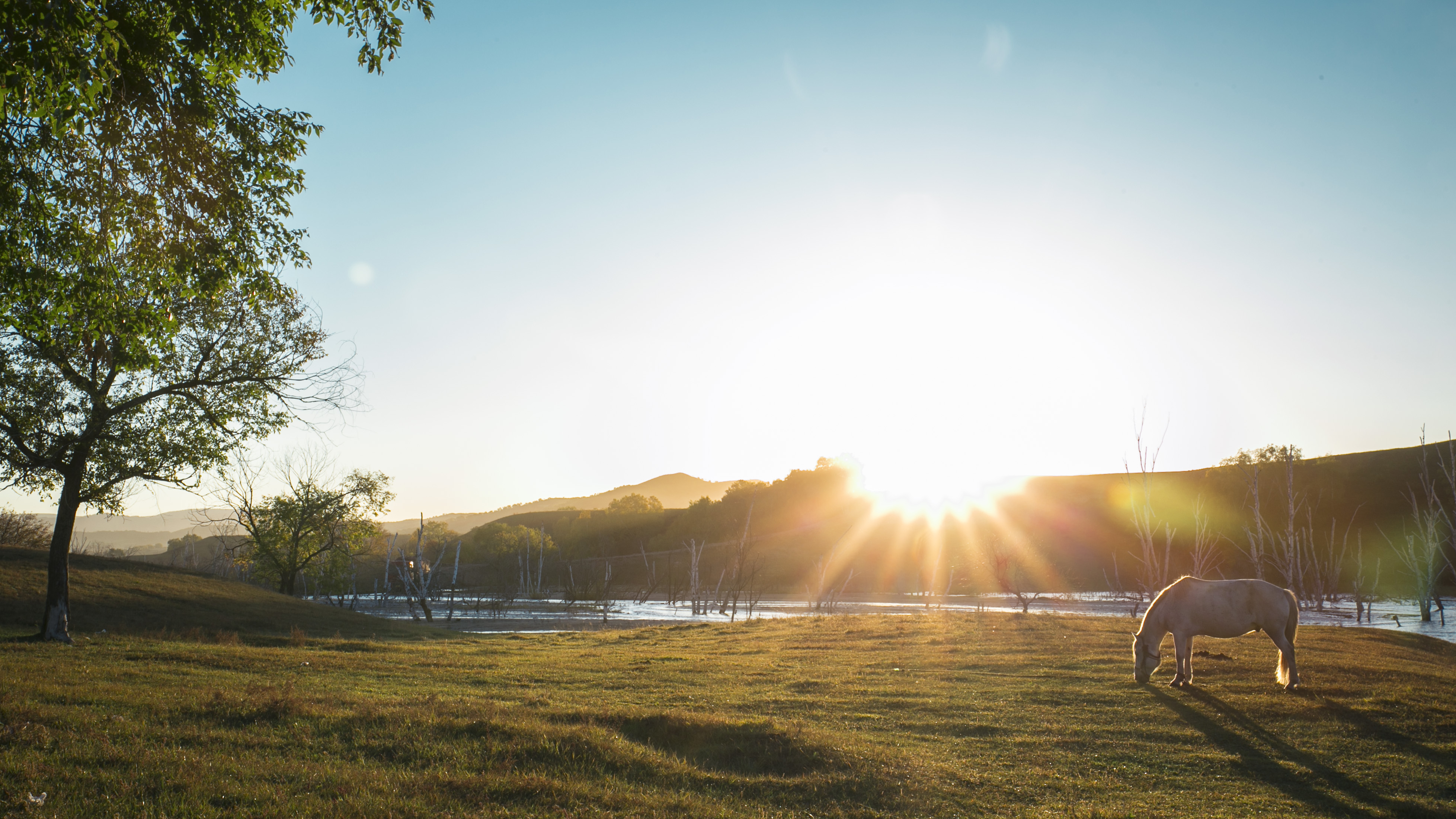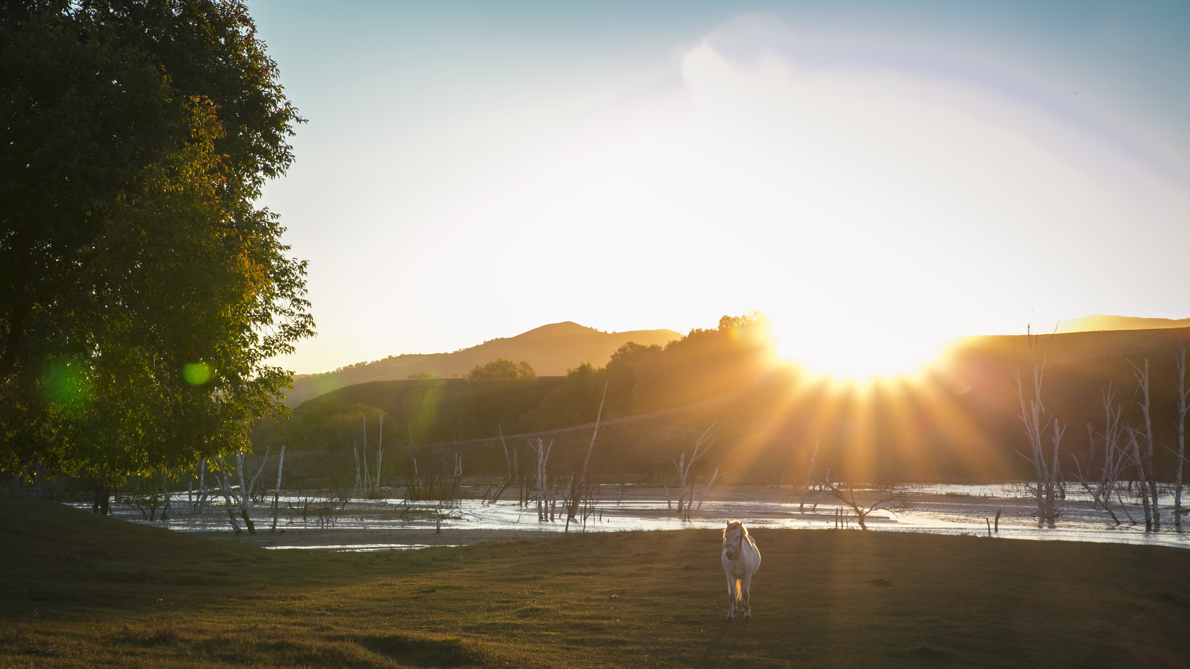 偶然间下到通风沟山下,不一样的风景,不一样的日出。一棵树,一匹白马,勾画出安逸祥和的画卷。