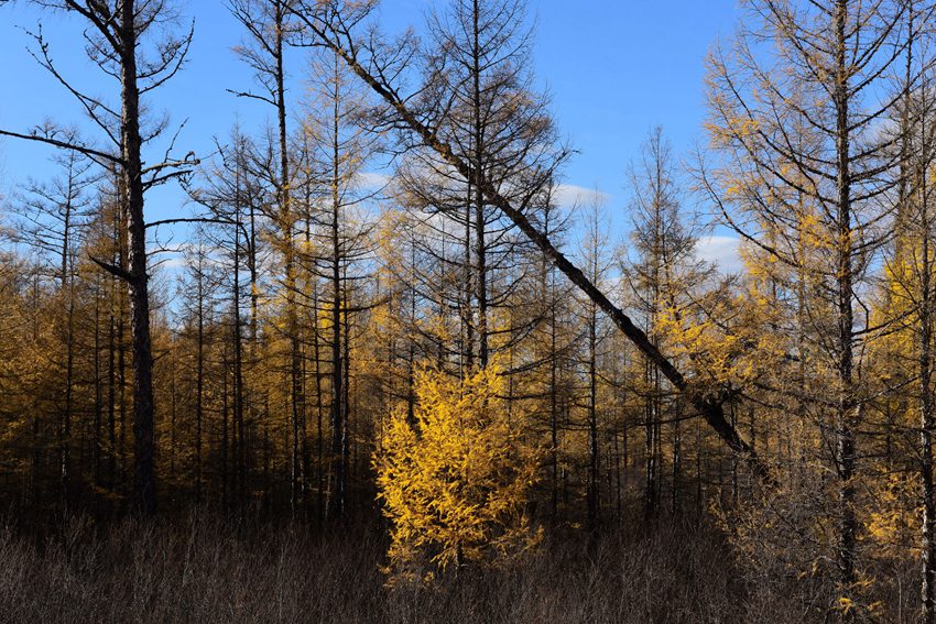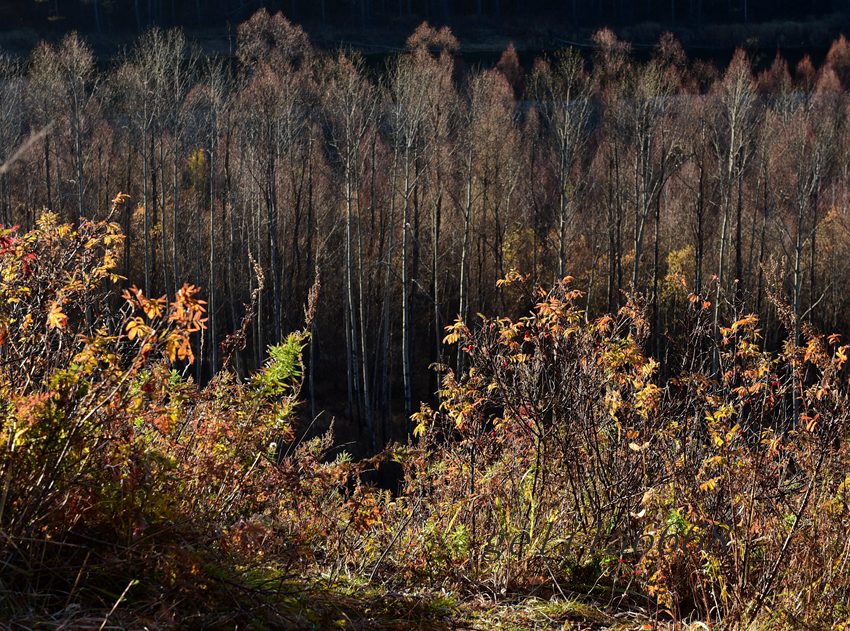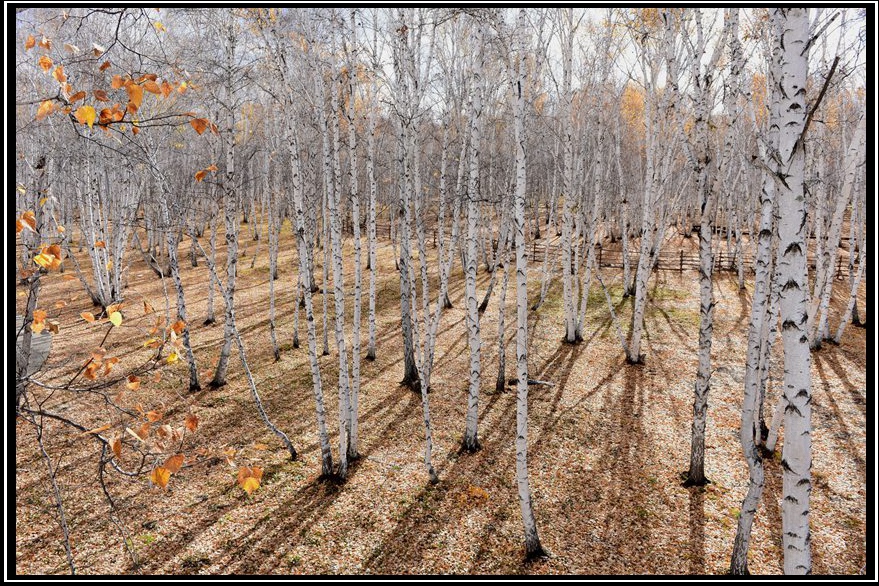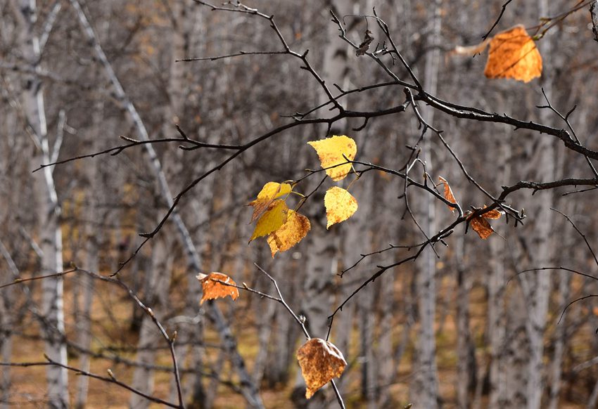 白桦黄叶是秋色的标志之一,可我们9月28日到达额尔古纳白桦林景区时,已经过了秋叶的好时光——树叶差不多都掉光了。我在林中逡巡的目的只能是寻找树上残存的黄叶,然后,等待偶尔扫过的阳光。