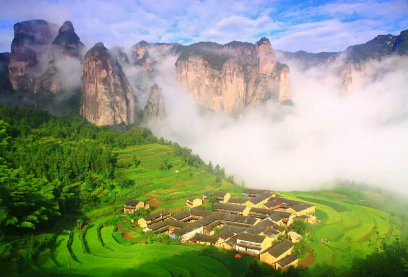 公盂,位于浙江省仙居县田市镇境内,被称为“江南的香格里拉”。公盂山势巍峨,气势峥嵘,地型构造复杂多样,以火山熔岩为主,每当旭日东升,公盂村的小狗、老人、古朴的山地民居、金黄的油菜花、村庄周边层层叠叠的梯田、苍翠欲滴的竹林以及不远处形态各异的群峰都沐浴在金色的阳光里,构成了一幅令人神往的山水画卷。