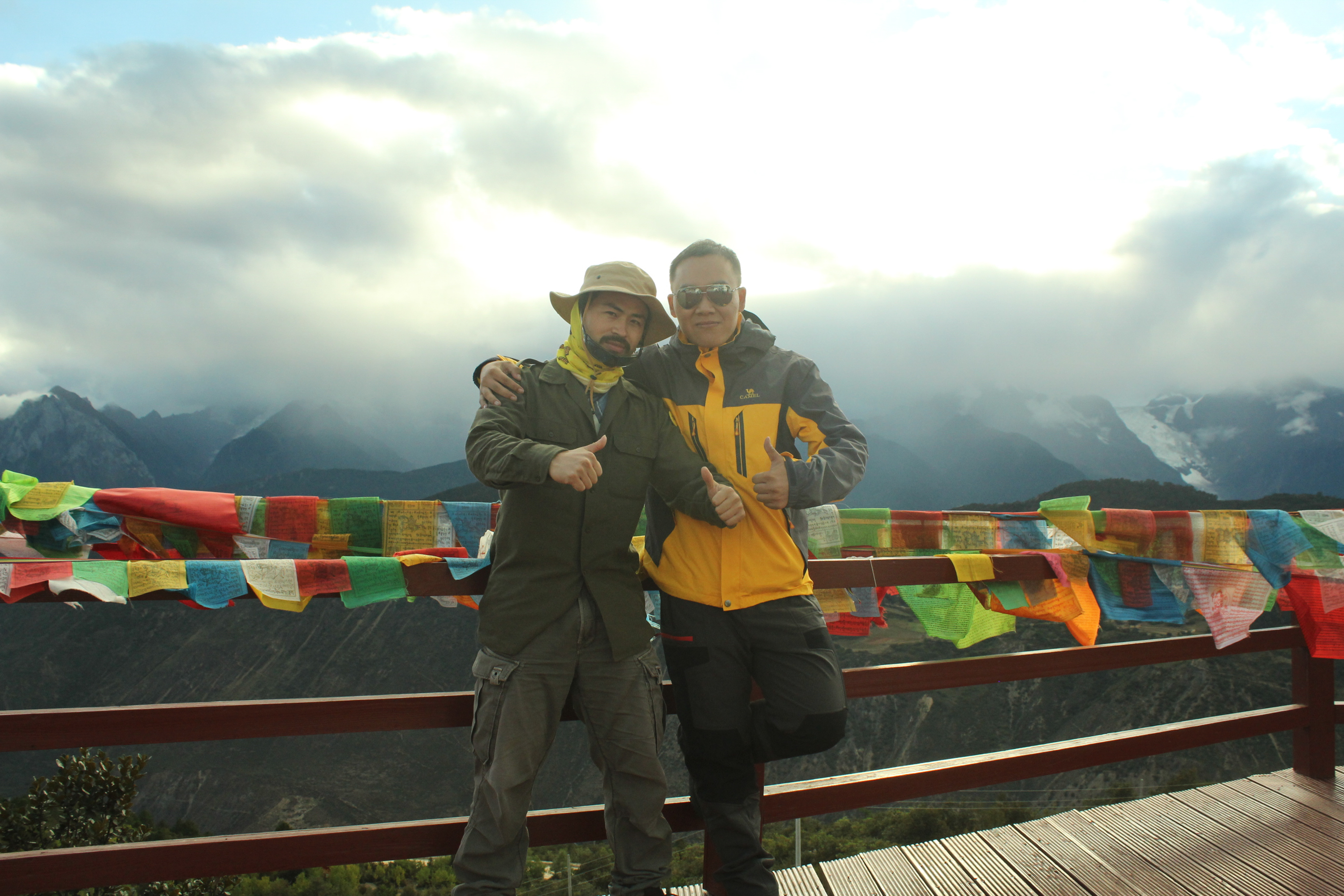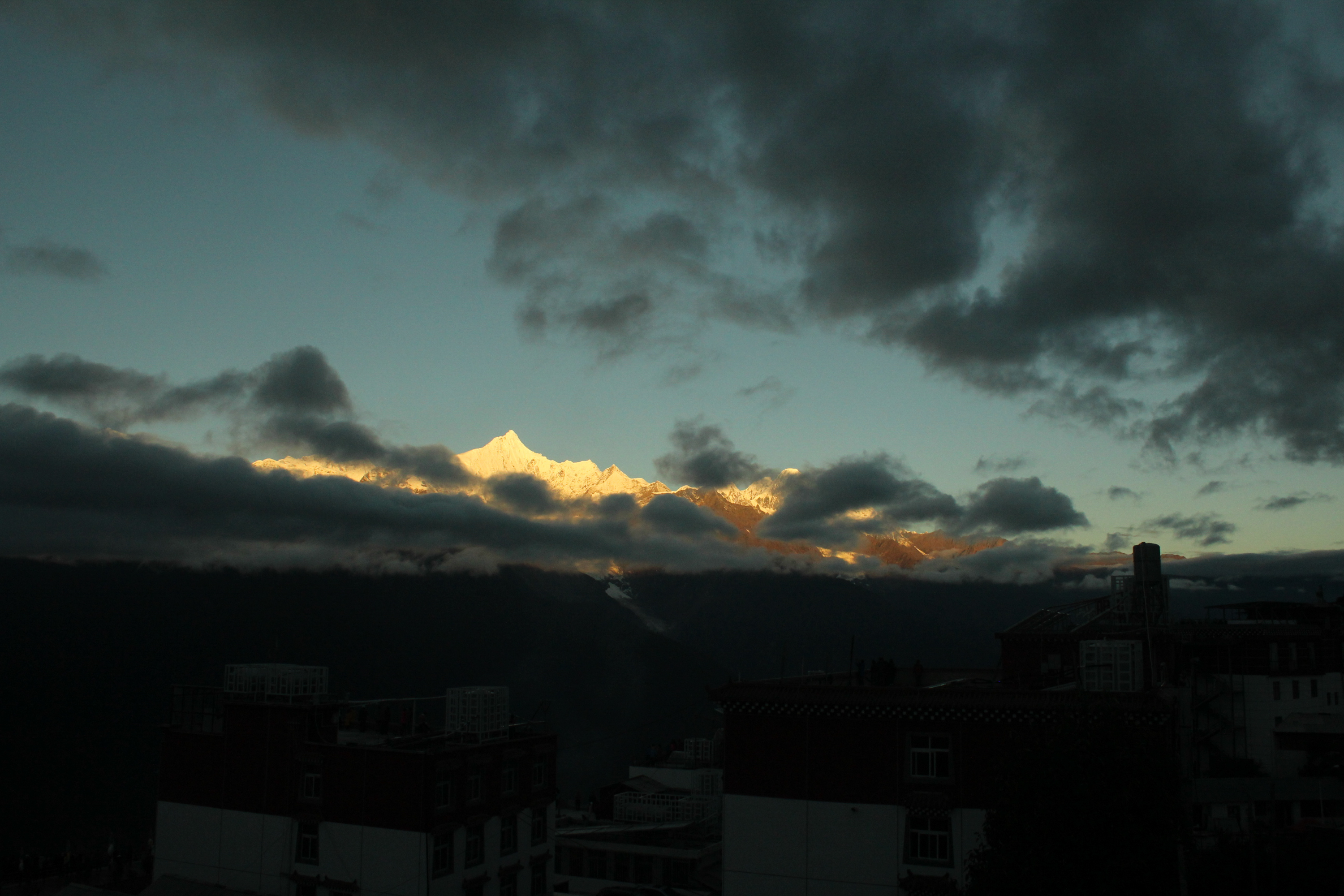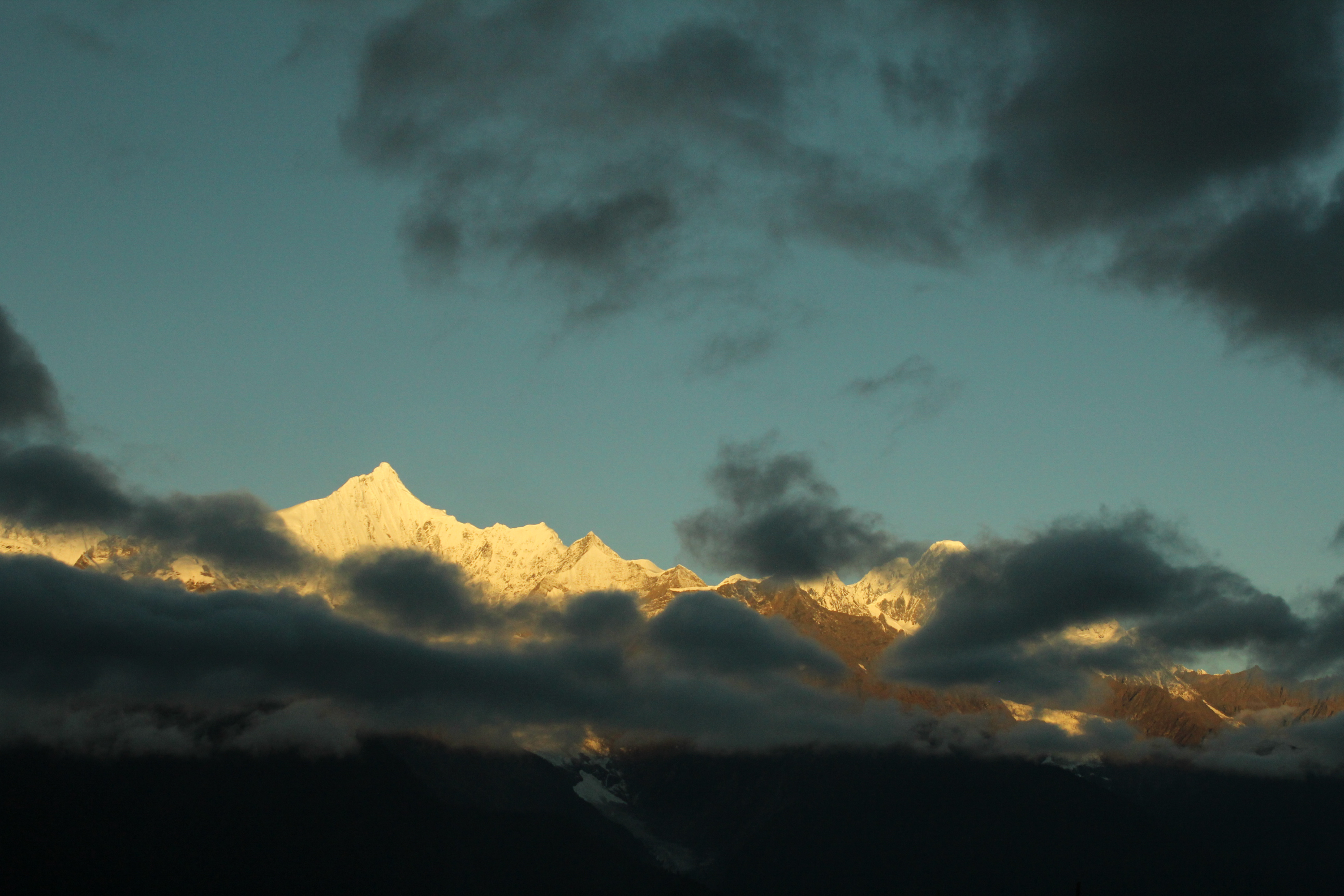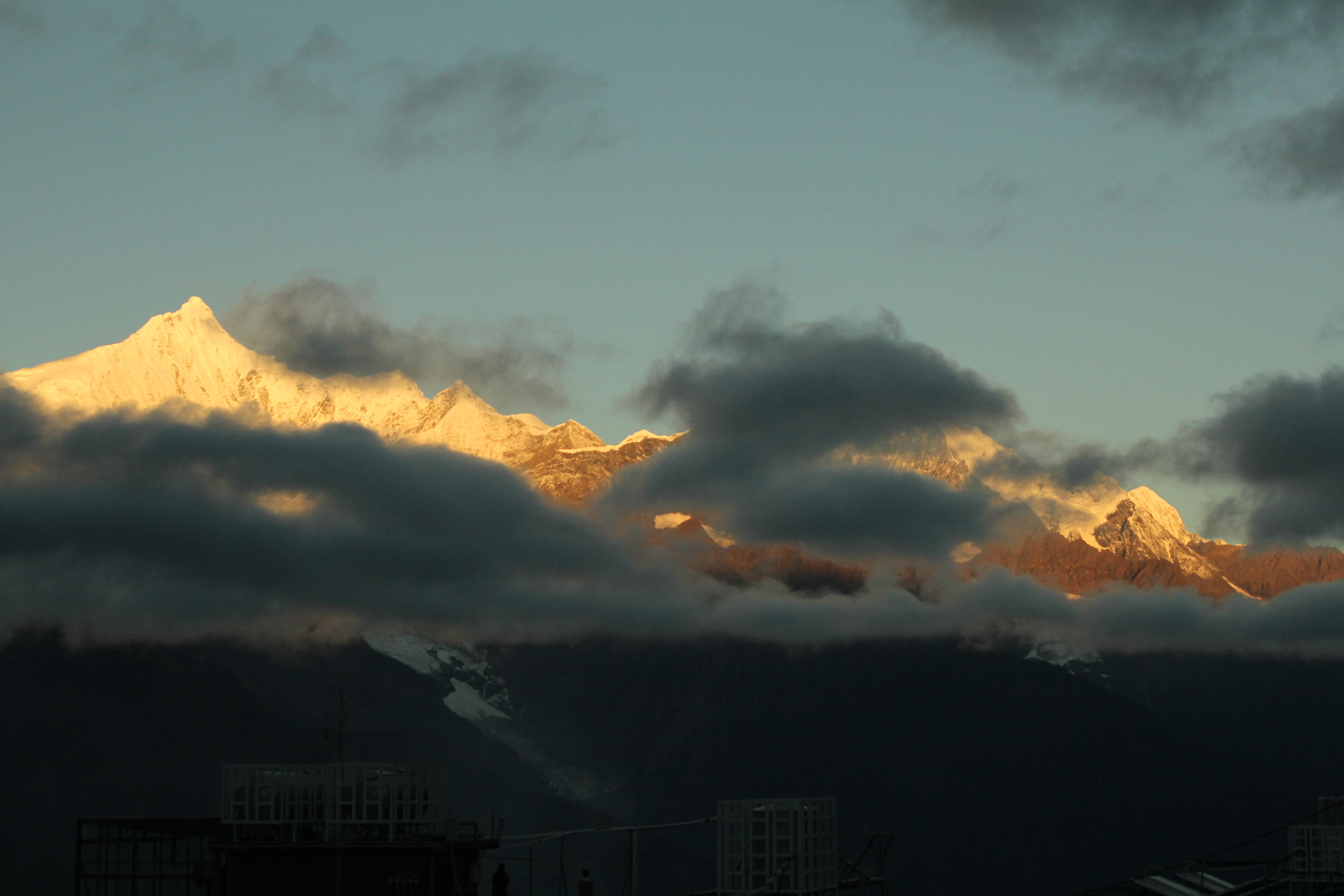 那一天我们以为我们不会看到梅里雪山,因为去程没有看到,但是地接导游多吉告诉我们,他会念经,一定能看到,心诚则灵。在回城的路上,还是阴雨绵绵,可是谁知道晚上我们就看到了月照银山,早上我起床一睁眼,天呢,惊艳!!