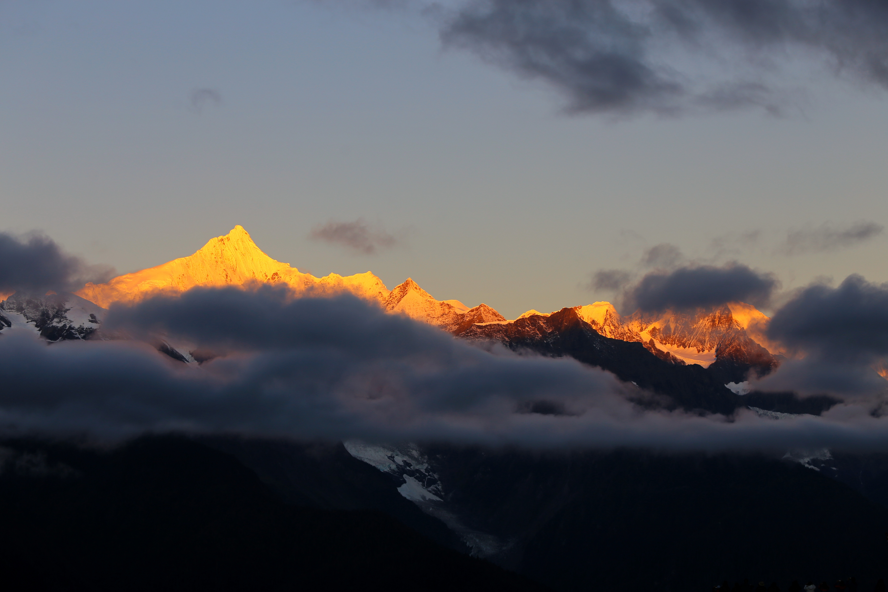 卡瓦格博,在人们的守望中不知不觉地被太阳抹上了一层淡淡的胭脂红,接着,又被涂上了一层薄薄的玫瑰红,不一会儿,又被染上了亮亮的桔红。大自然像位神奇的化妆师,把瞬息万变的色彩挥洒在雪山之颠,美轮美奂,光彩照人。慢慢地,缠绕在峰顶的云彩被镶上了金边,变亮了、化开了,神女峰、五子峰、将军峰、护法僧峰开始一座座地显现。当最后一朵祥云飞过的时候,卡瓦格博终于缓慢地露出了尊贵的容颜。此时,近两百人的观景台全场鸦雀无声。