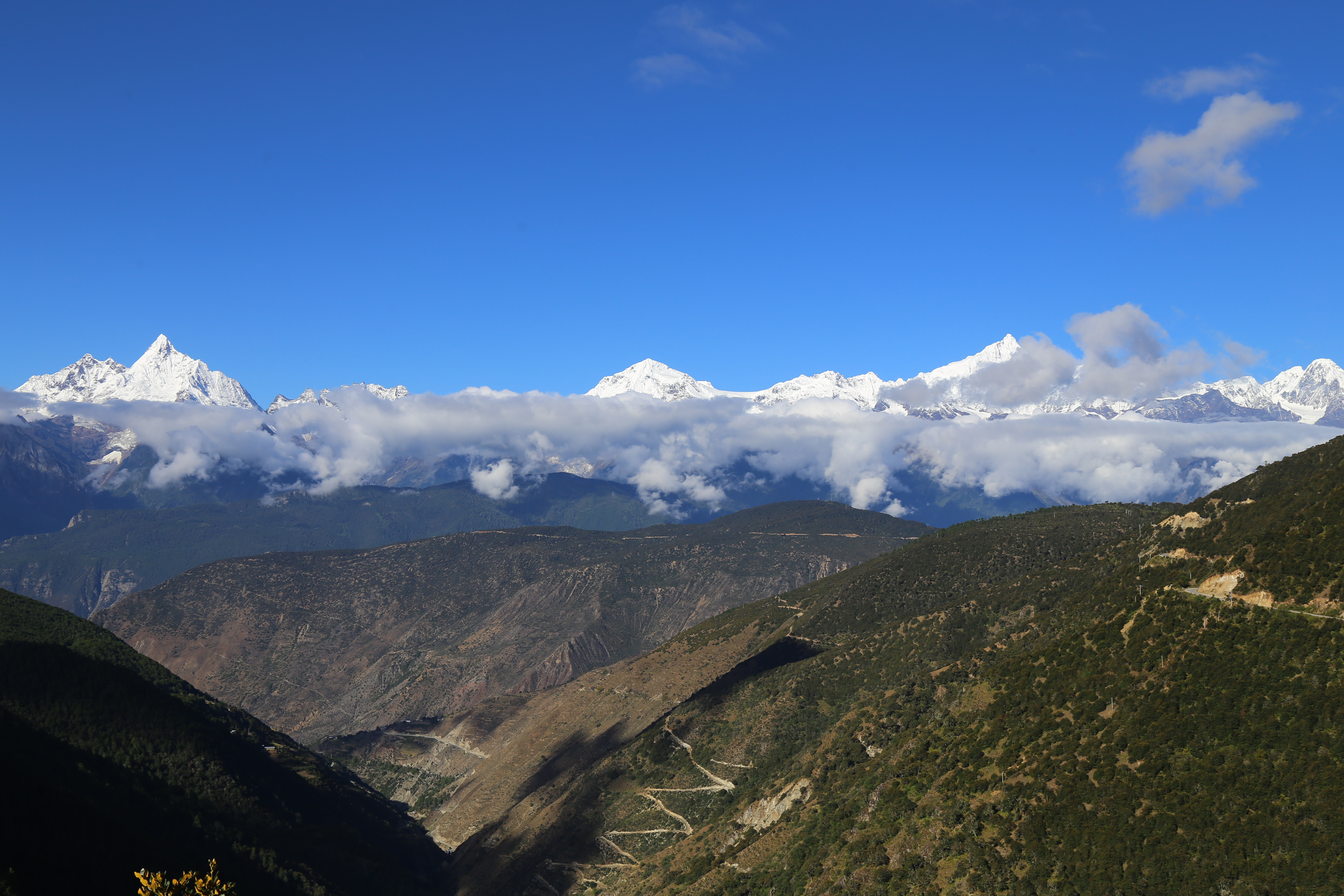 翻过重山,掠过冰川,漫步云端,云彩时常缠绕在身边,这里的蓝天总是如此的“不真实。”也许,只有亲身体会,方能感知这无以言表的奇妙。汽车在波峰浪谷中穿行,公路一直蜿蜒向上,一会儿被推上高高的峰顶,渐渐的,一会儿又滑向深深的峡谷,大山就像波涛一样涌向天际。