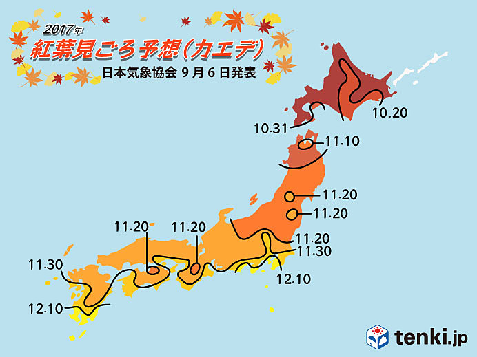 日本红叶前线,就是日本各地的枫叶变红的时间预测,因为枫叶变红的时间可能就几天时间,然后温度一降或着一场雨雪,可能就会让红叶凋零,日本的红叶一般由北红到南,主要和气温有关系,11月底的时候东京的红叶还没红,但北边日光的红叶却早已凋零了,所以一般去之前可以先在网上查一查红叶前线。或者到当地的时候咨询一下更靠谱哦。以下是日本气象厅2017年的红叶预测:https://tenki.jp/kouyou/expectation.html