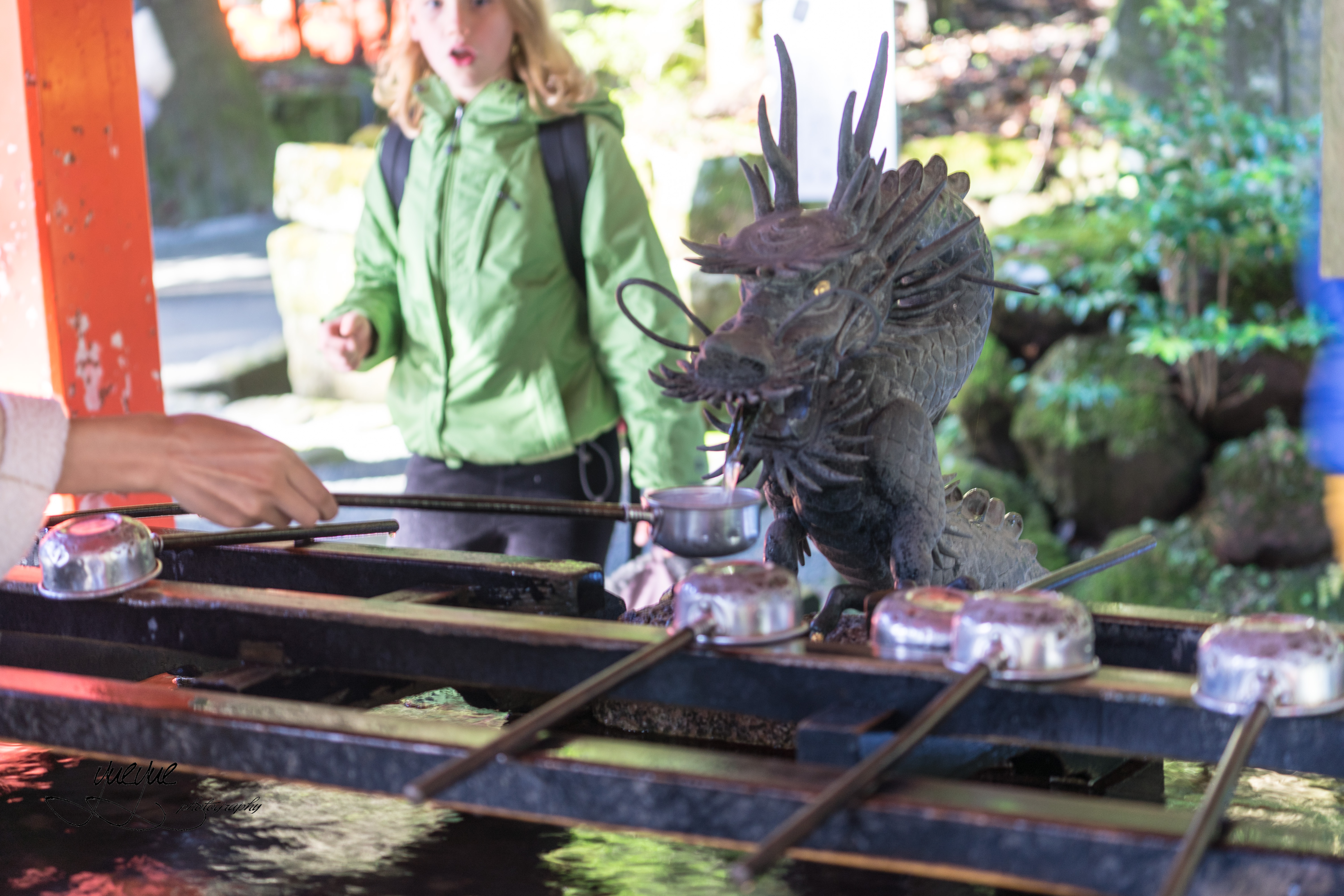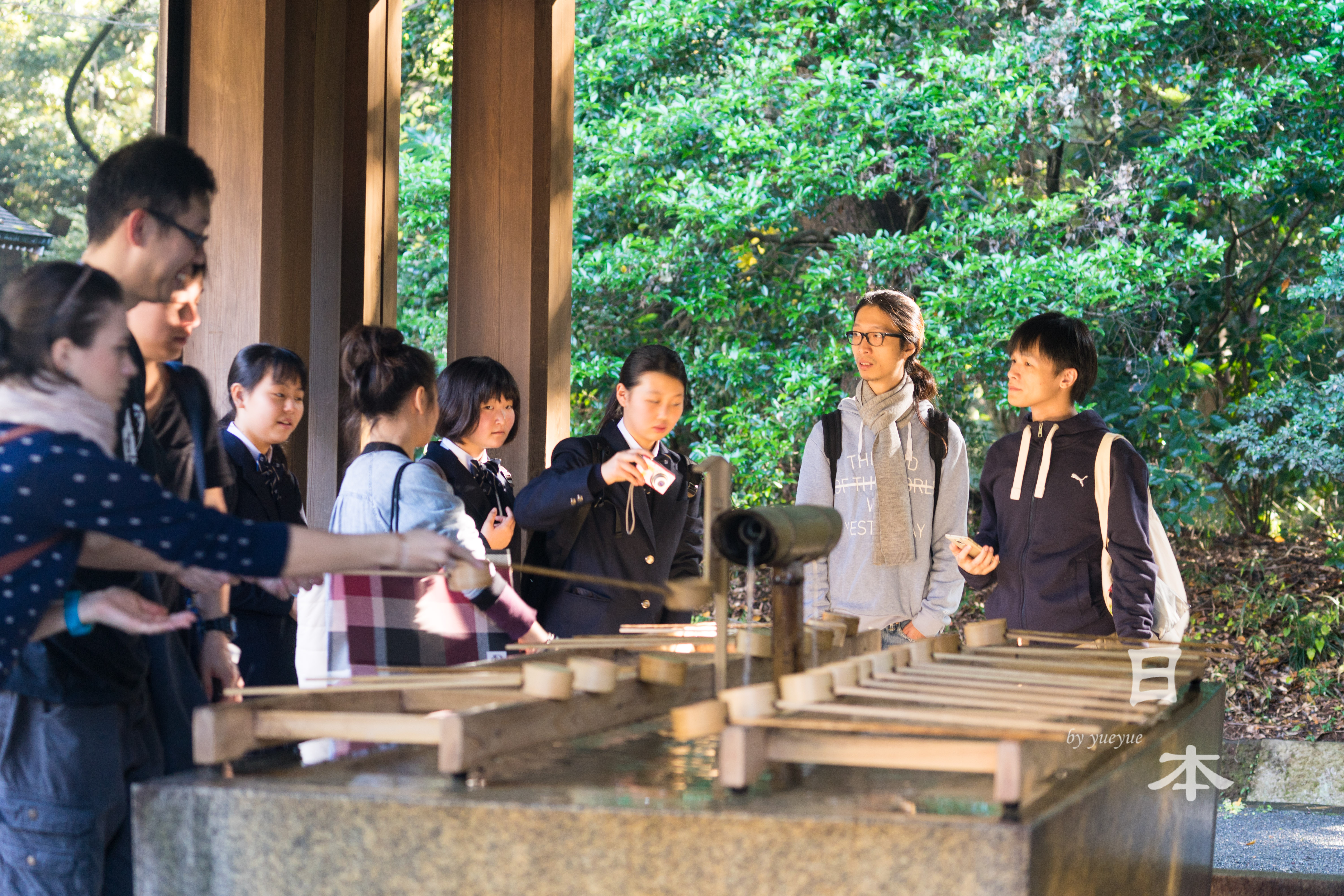 神社参道旁边有水池,据说就是需要大家在参拜之前洗干净手,漱干净口,表示对神明的尊敬,一般是先洗左手,再洗右手,再用左手接住水轻轻漱口,再洗一次左手,最后直立水舀,用水把舀子把手洗干净,最后把舀子放回原位。