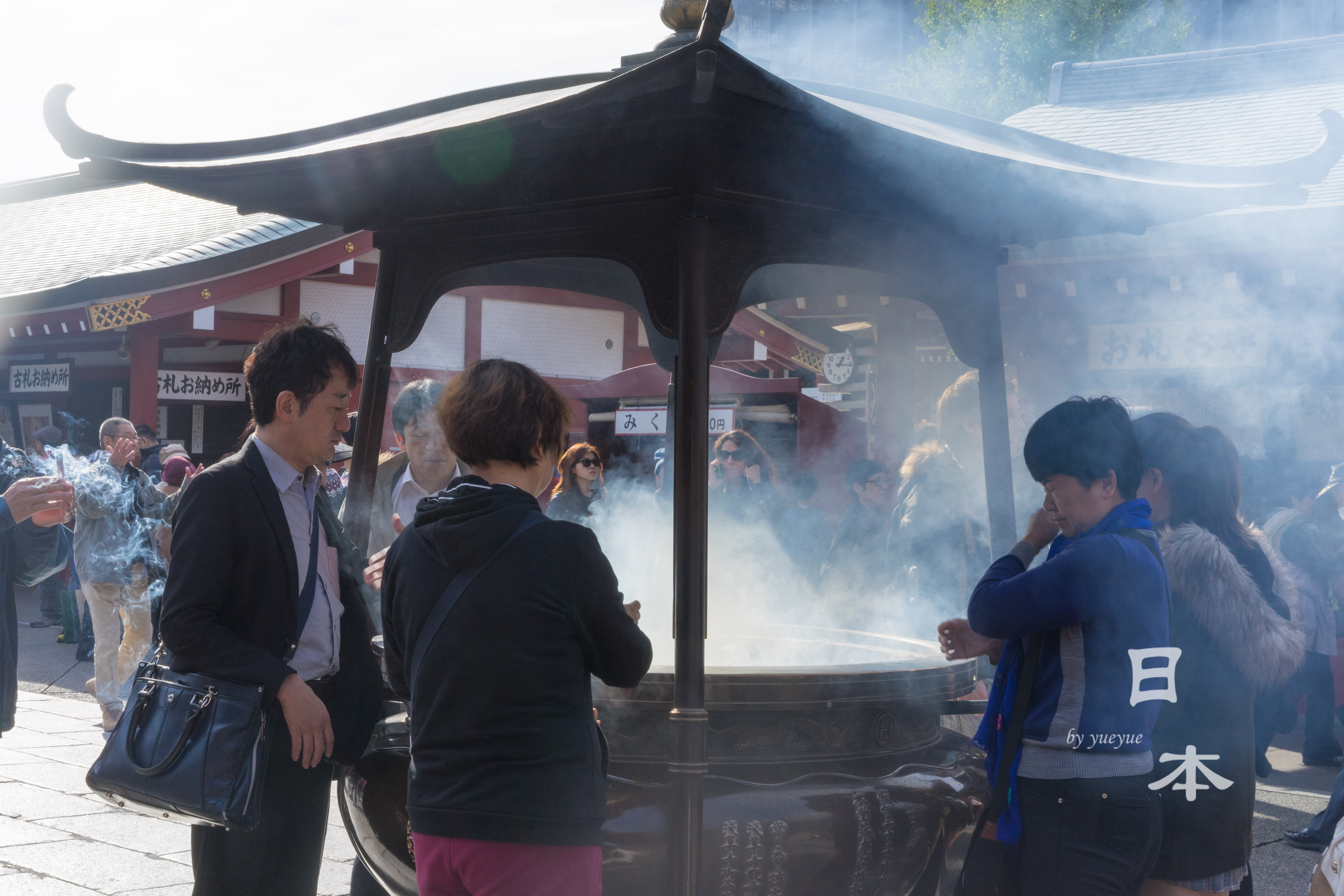 浅草寺内的一个香炉,很多人会把香炉的烟往身上捞,似乎都是带有保护、健康、庇佑等概念。