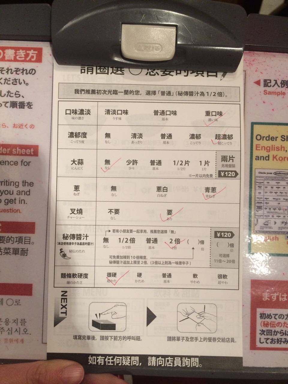 一阑拉面推荐指数:一阑拉面我觉得大概是日本最好吃的拉面了,面可以选择软硬,汤可以选择浓郁还是清淡,不同的辣度。可以加面也可以加饭,据说加饭更赞。单人的位置是这样的小格子,不受别人打扰。。从这里就可以看出日本的服务确实是很好啊..