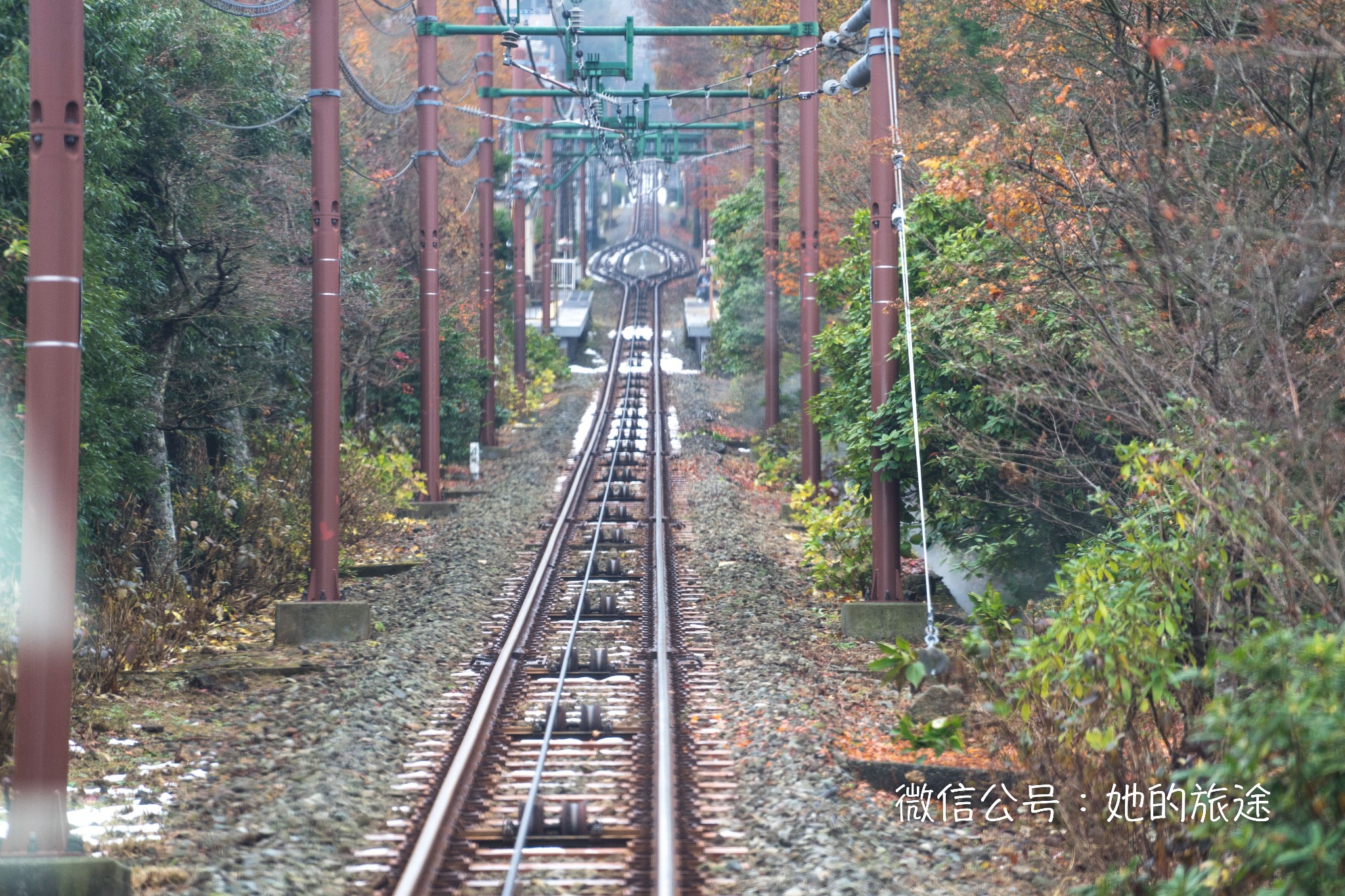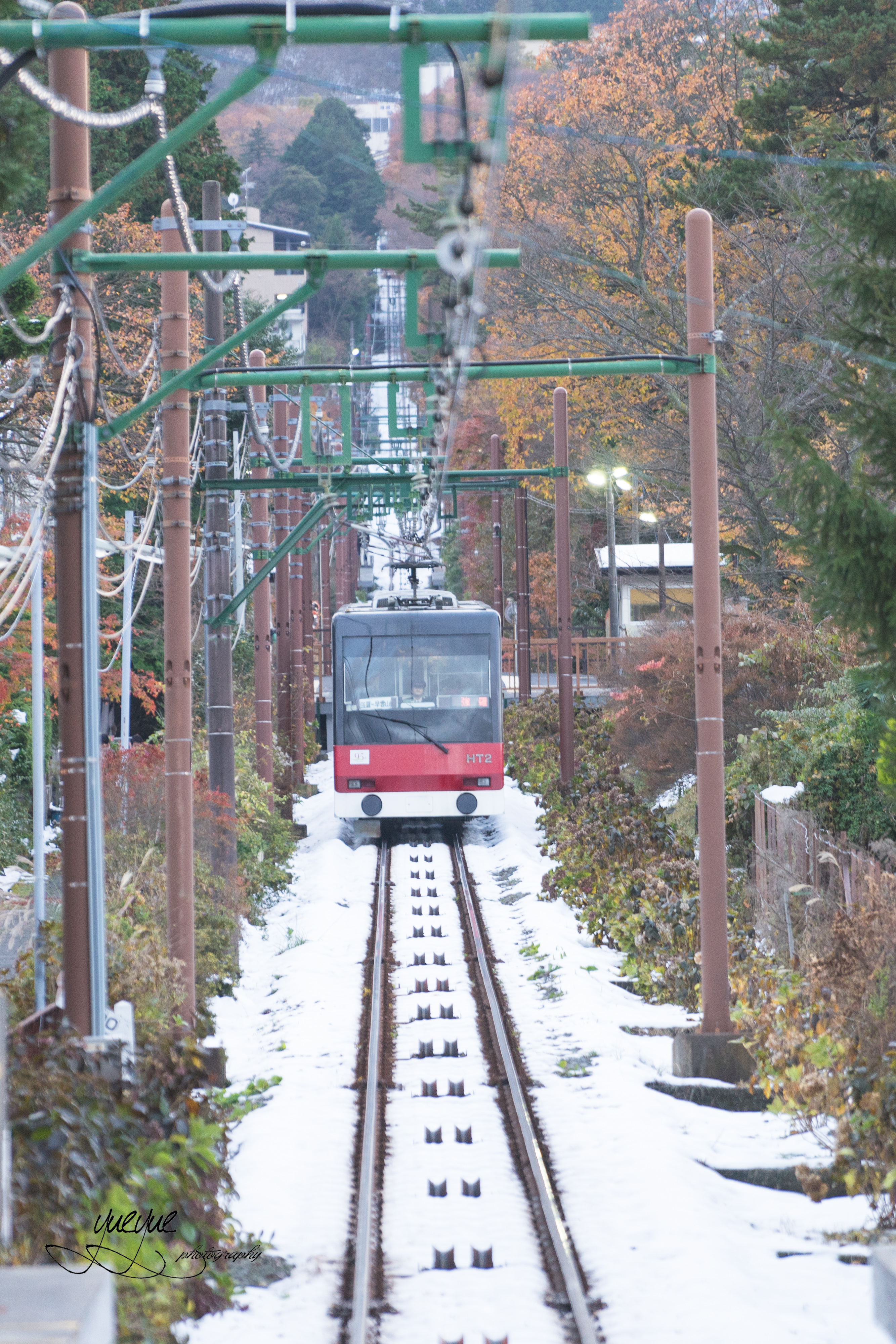 通往早云山的登山缆车,在积雪和枫叶的映衬下显得很童话...