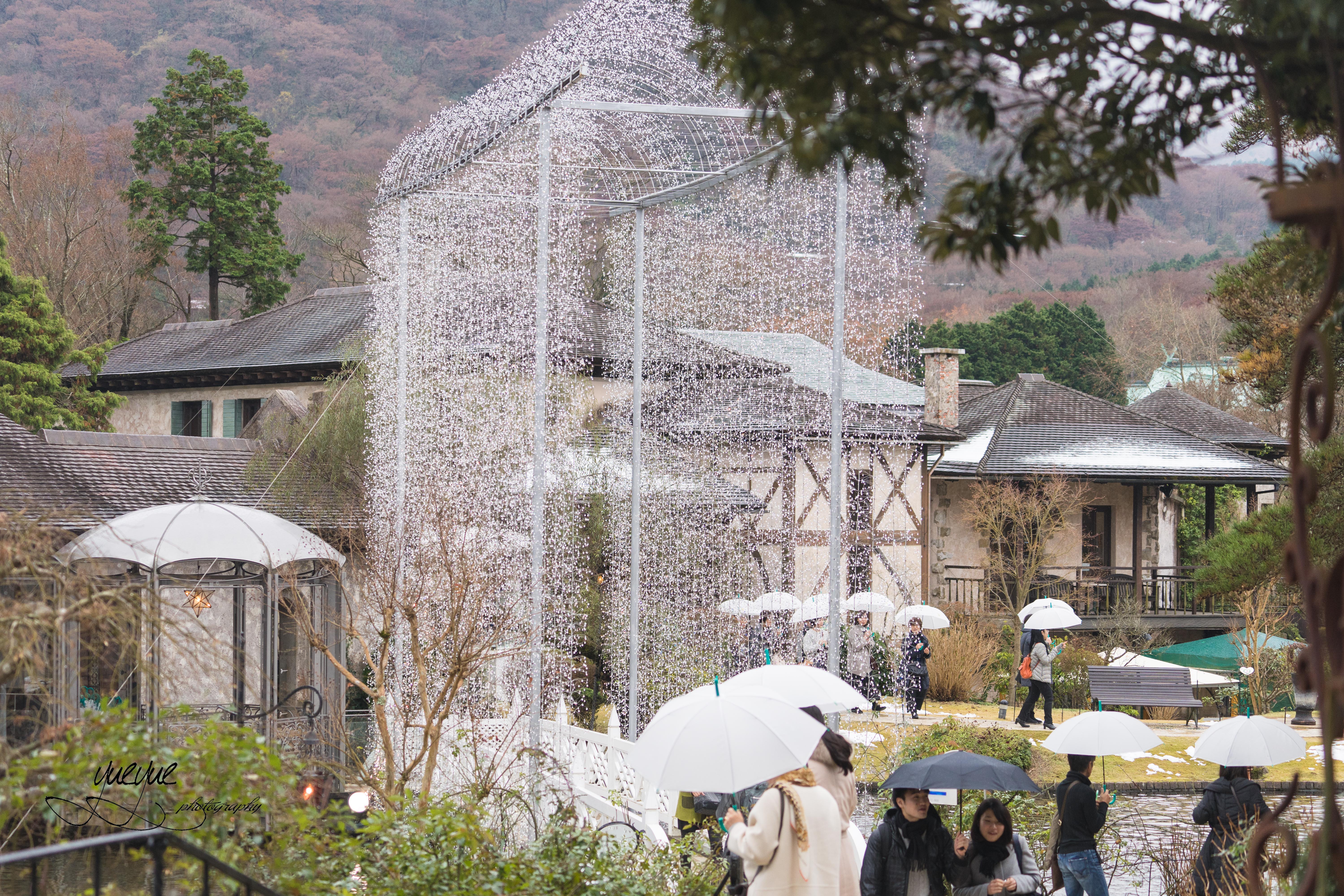 箱根还有大大小小的美术馆和博物馆,有兴趣的话可以慢慢参观,最有名的应该是雕刻之森美术馆和玻璃之森美术馆。由于天气不太好,放弃了在室外的雕刻之森,去参观了玻璃之森美术馆....欧式的庭院,下雨天大家都用起了美术馆内提供的清一色白色透明雨伞,看起来更是别有一番风景...