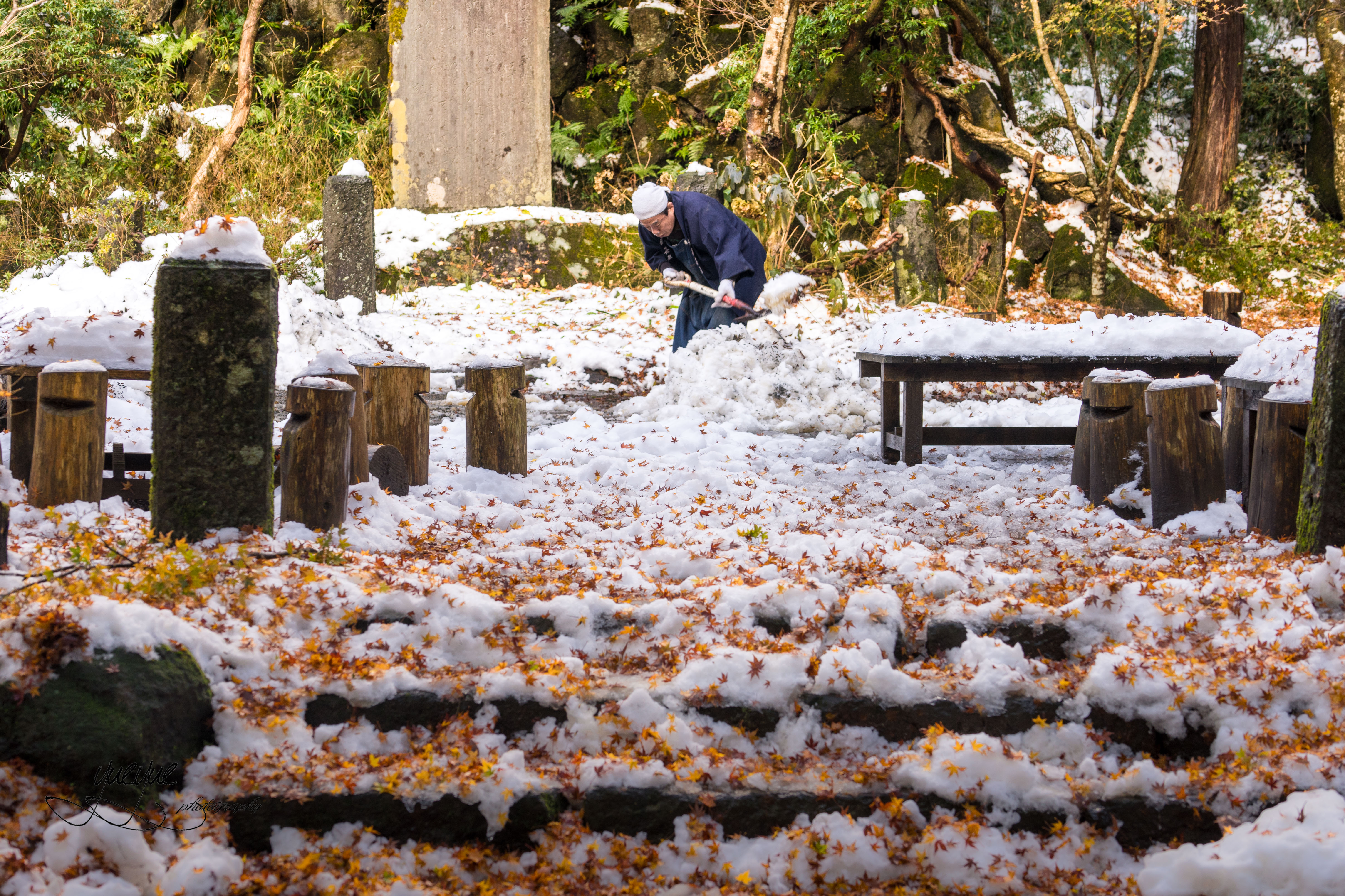 从晴见茶屋出来往前走了一段,在路边看到了左边有一个通往上上的岔路,路口挂着着“箱根旧街道”的牌子,很好奇就往山上走了,一路上的雪还没化,阳光斑斑驳驳地洒下来,显得很幽静。