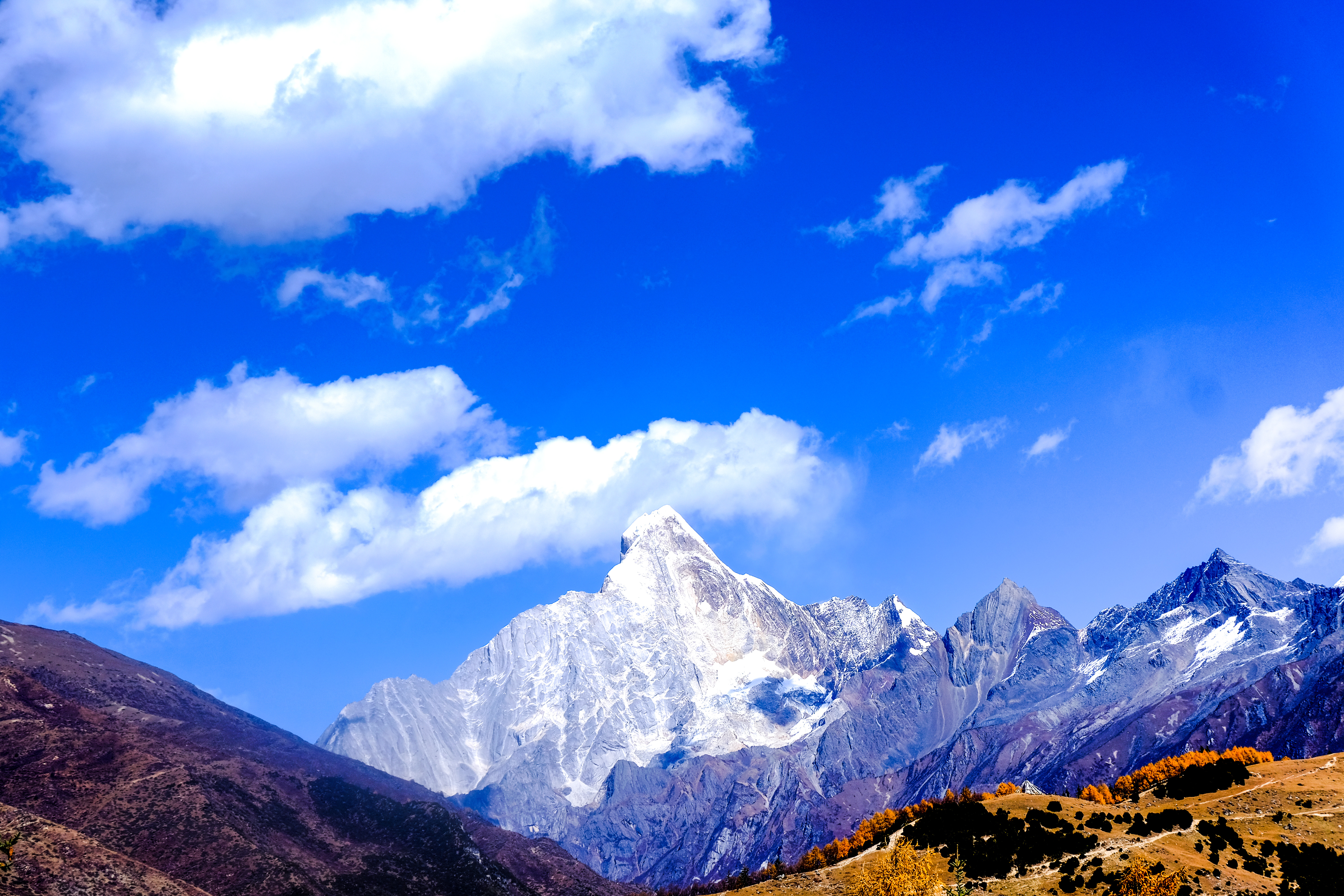 山上白雪皑皑,山下层林尽染,秋意甚浓,蔚为壮观。我们休息一会儿下山赶路。