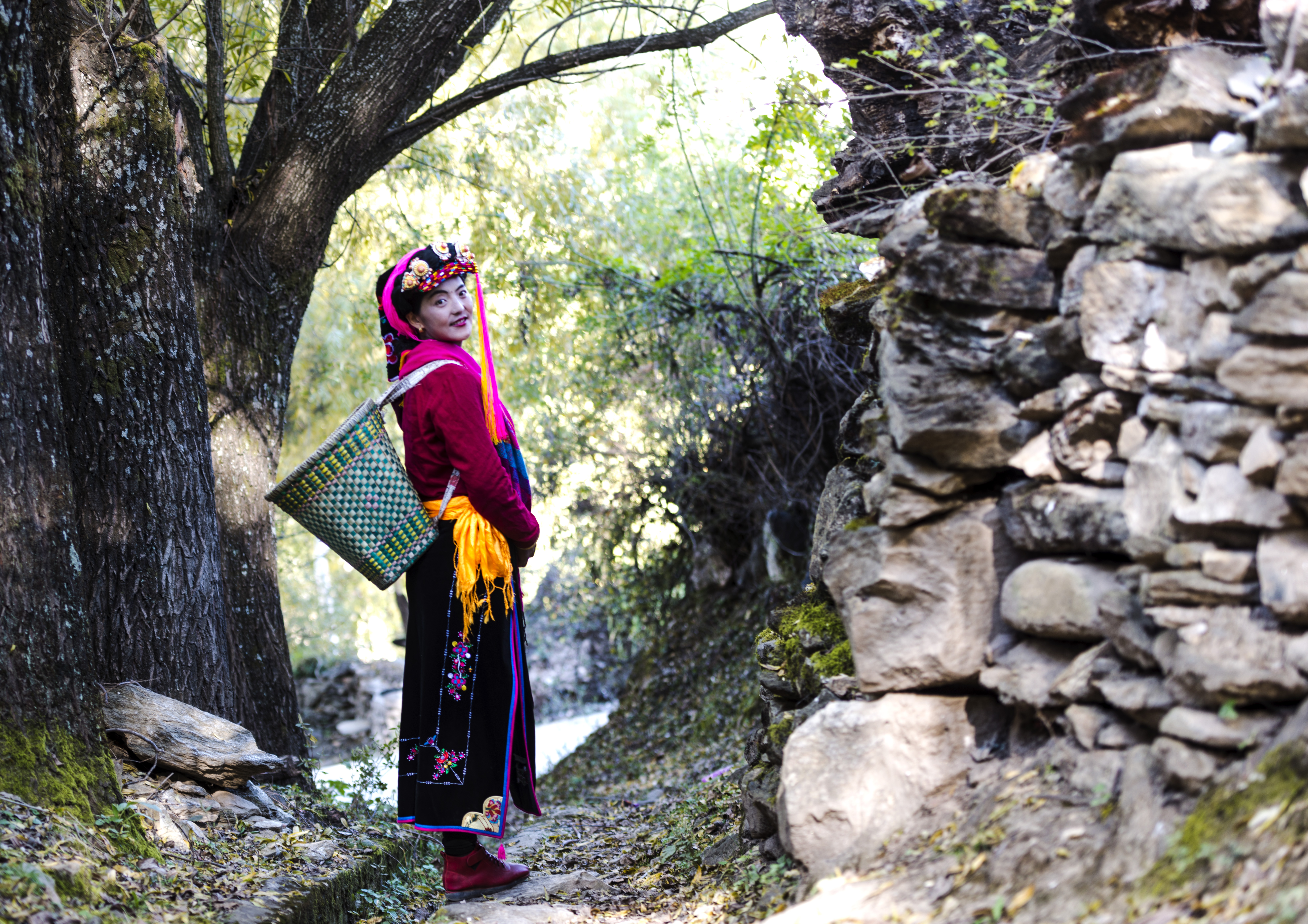 回到德吉,早餐后的“节目”拍丹巴美女,丹巴是一个出美女的地方,此地每年都有一次选美比赛。我们拍摄的模特儿是选美比赛的获奖者,一位藏家女子,背着小背篓,走在小路上,遇到我们这群好色之徒,掏出相机象王老虎抢亲一般“狂轰滥炸”。
