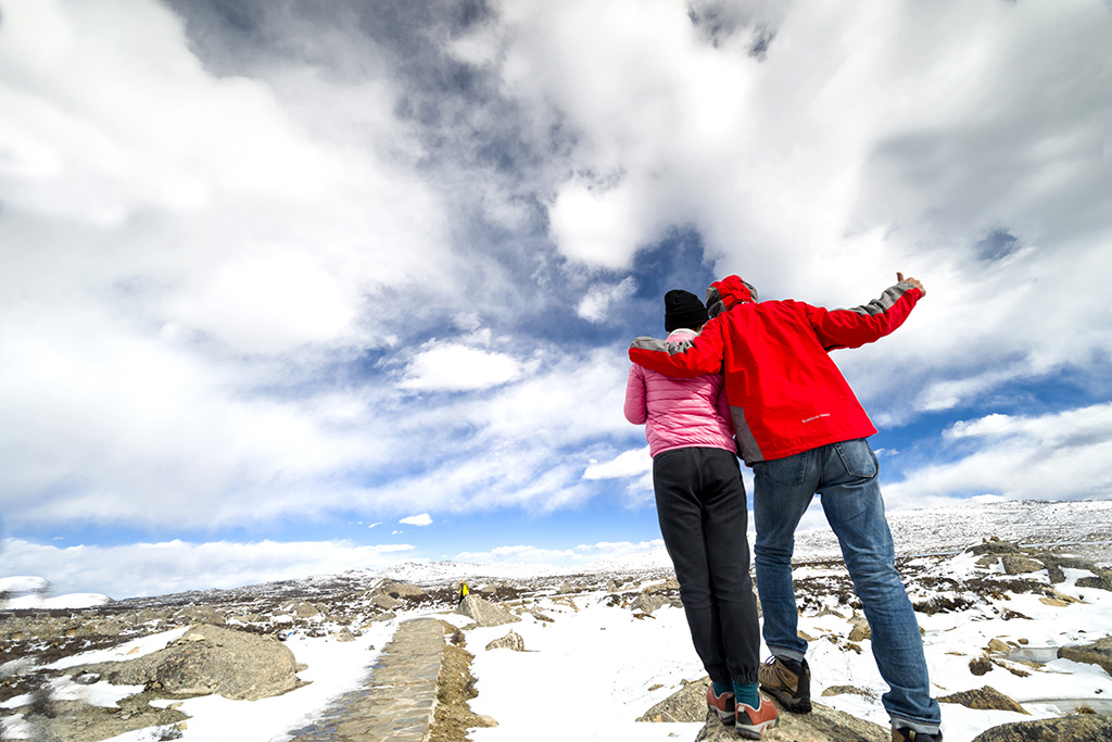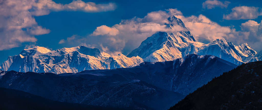 翻巴郎山,过巴郎山隧道,不久到猫鼻梁观景台,此处可近观远眺四姑娘山,四姑娘山被称之为蜀山之后。我们下车第一眼见到的幺妹峰,正被飘过来的一片云遮挡,象一块薄纱遮住了她美丽的容颜。可是,几分钟后,那一片云飞舞灵动,云消雾散,幺妹峰露出了笑脸。