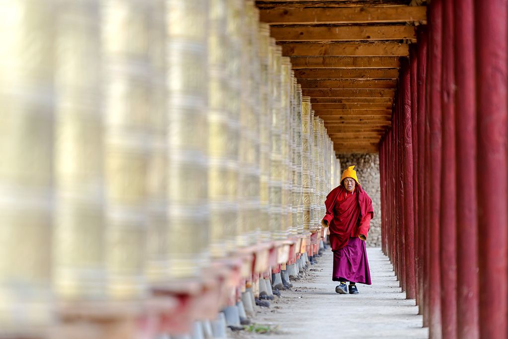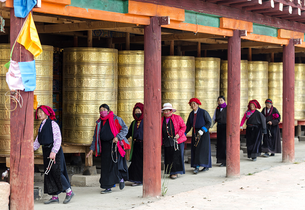 再往前右转即是惠远寺,此寺不大,可是皇帝钦定修建,也是十一世达赖克珠嘉措的出生地。我们走进寺院,看着一群藏族大妈围着高大的转经筒转经,我们微笑着道一声扎西德勒,她们回一声扎西德勒。感受一下藏族同胞对宗教信仰的虔诚,拍摄寺院建筑和转经的人,匆匆作别。
