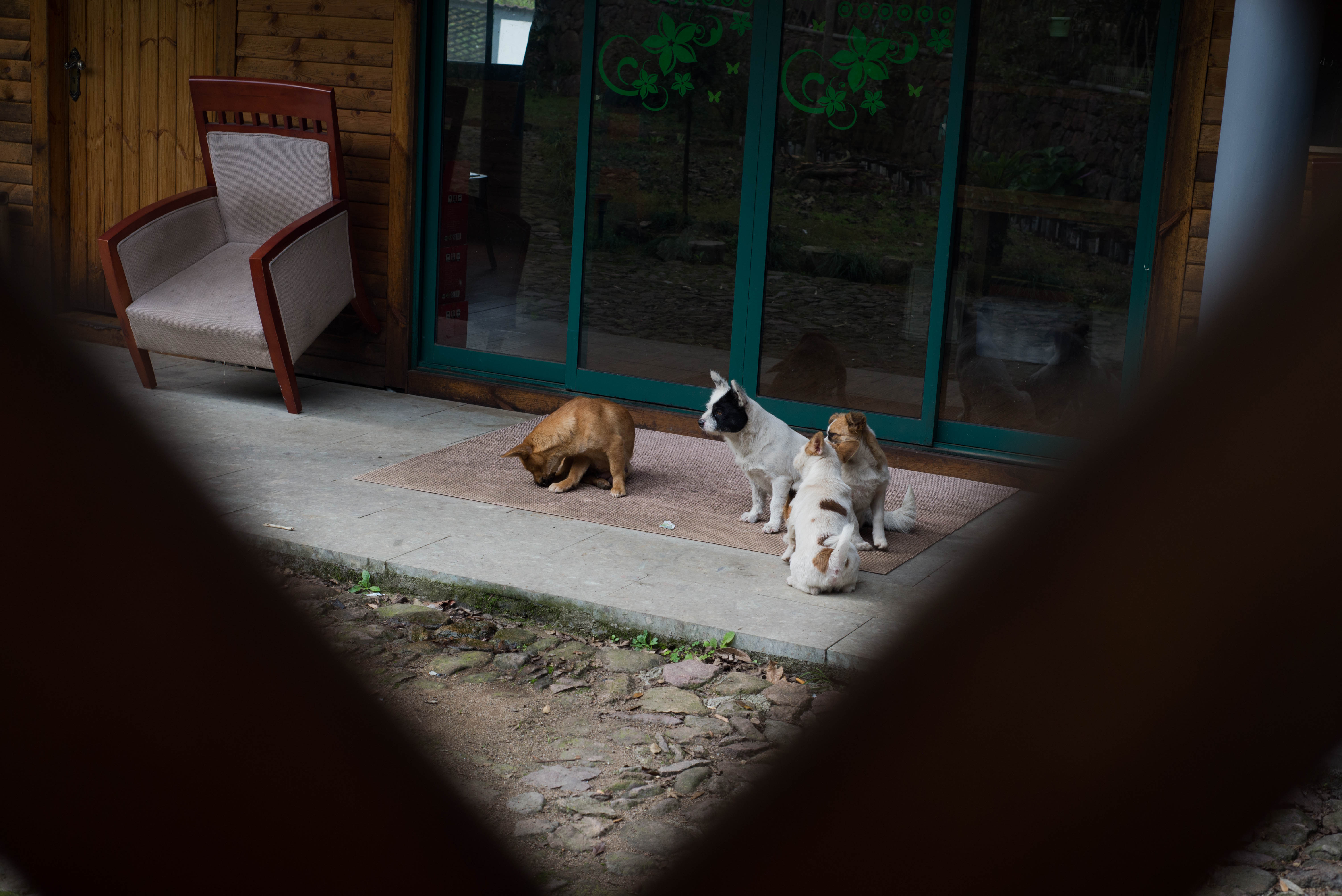 透过小孔。能看到院子里惬意晒太阳猫猫