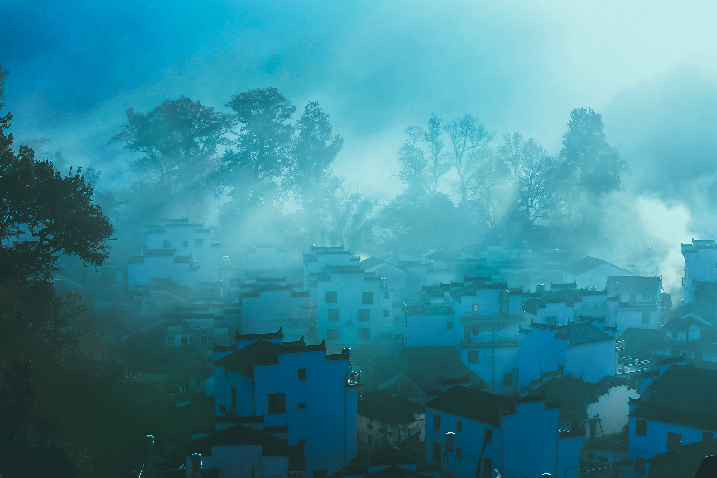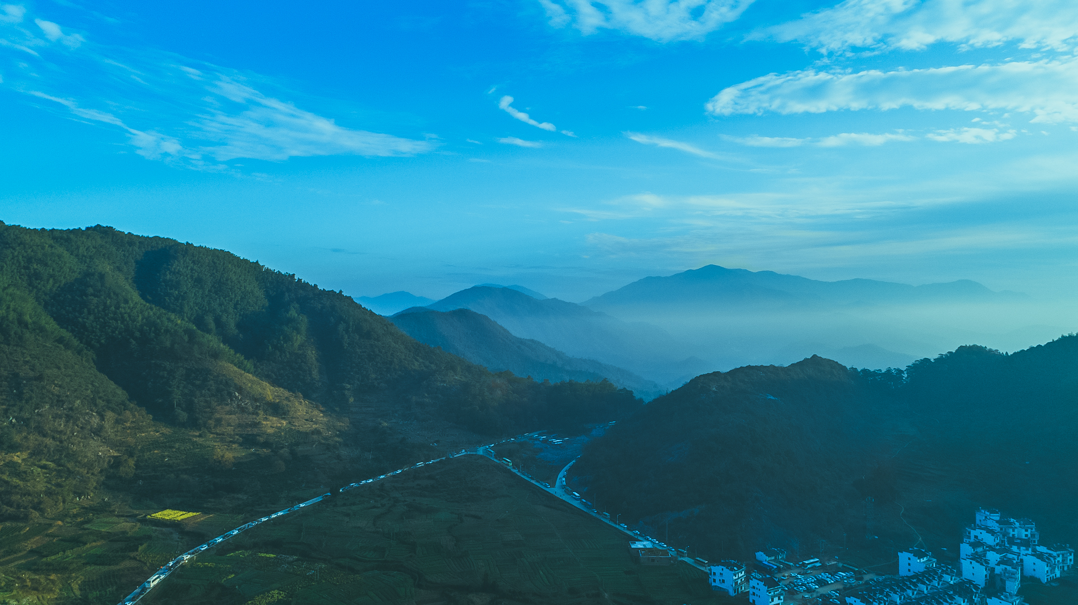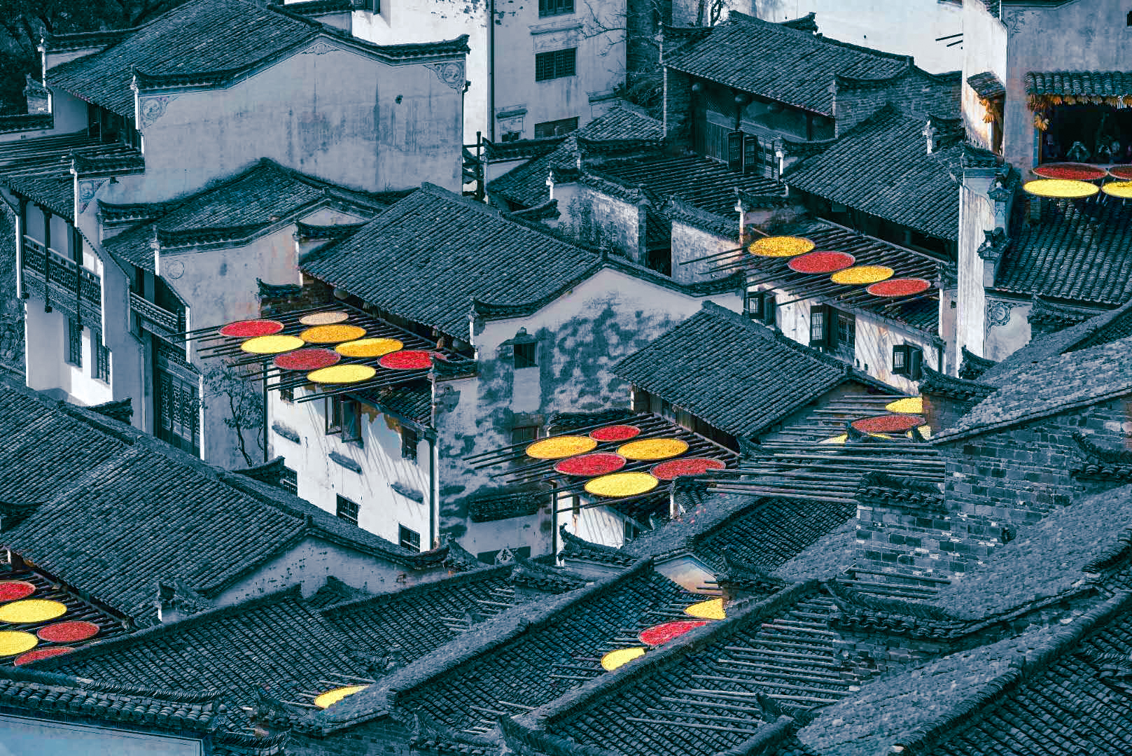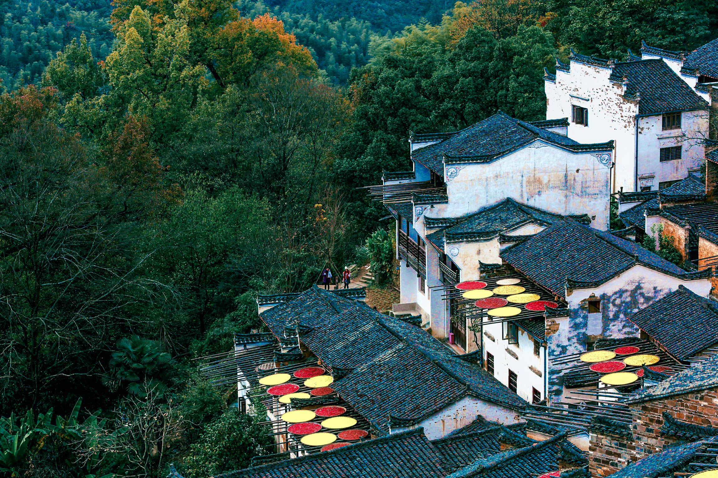 也是一座距今近六百历史的徽州古村。篁岭属典型山居村落,民居围绕水口呈扇形梯状错落排布。