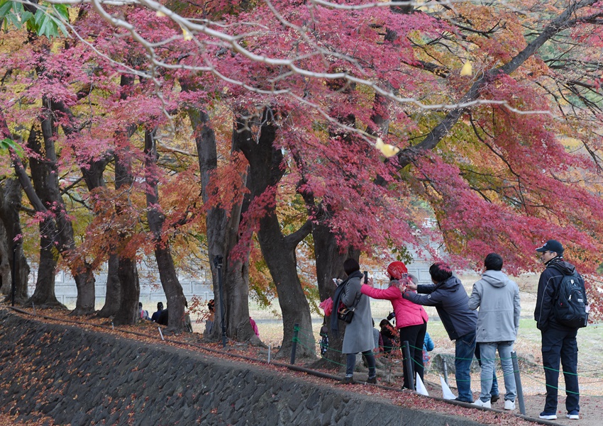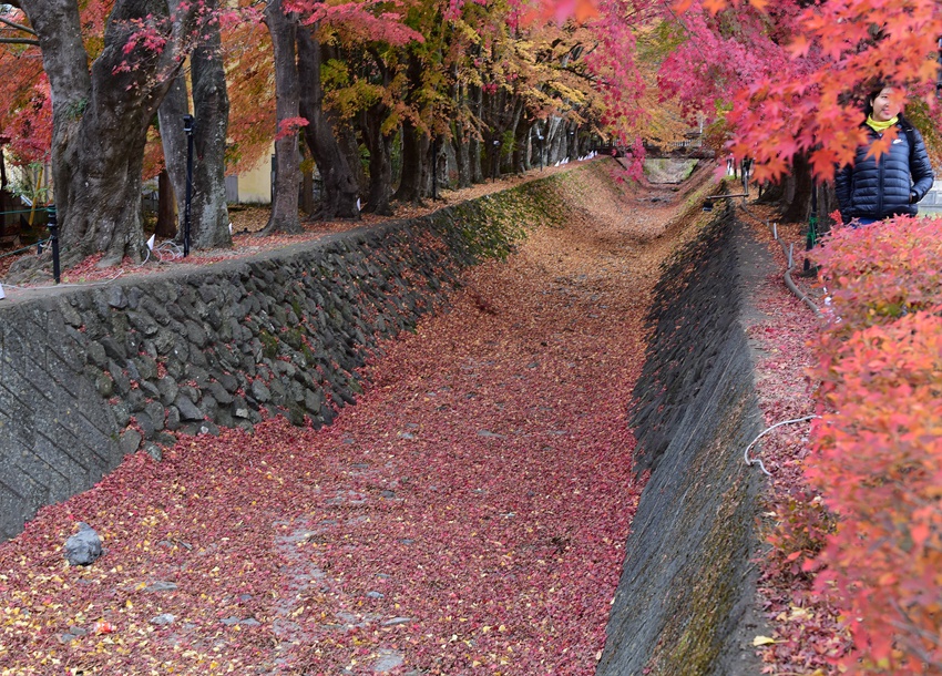 第一眼之浓艳着实吓了我一跳——干涸的渠道里近处铺满了黄色的银杏落叶,两旁枫树参天,伸展树枝上的枫叶把河道全部遮蔽了,没有阳光,河道深处显得较暗,那些树枝上的枫叶和落在河道中的枫叶就红的发紫了!