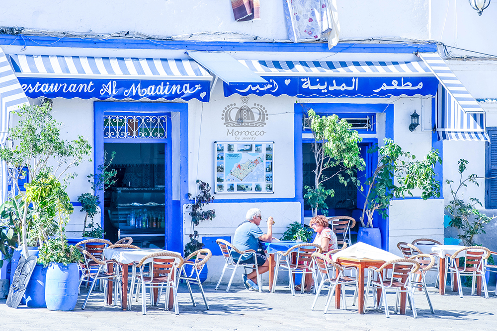 继续往前走,出城的时候路过一家咖啡店样子的街景,蓦然觉得跟我的裙子好搭,顾不得大太阳,就急吼吼的上去拍照,想让时光都融入在这个浪漫的小城里, 融化在北非艳阳的明媚里~