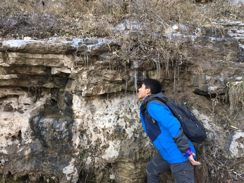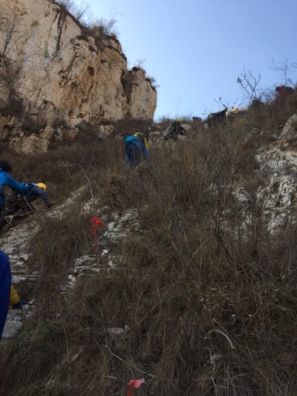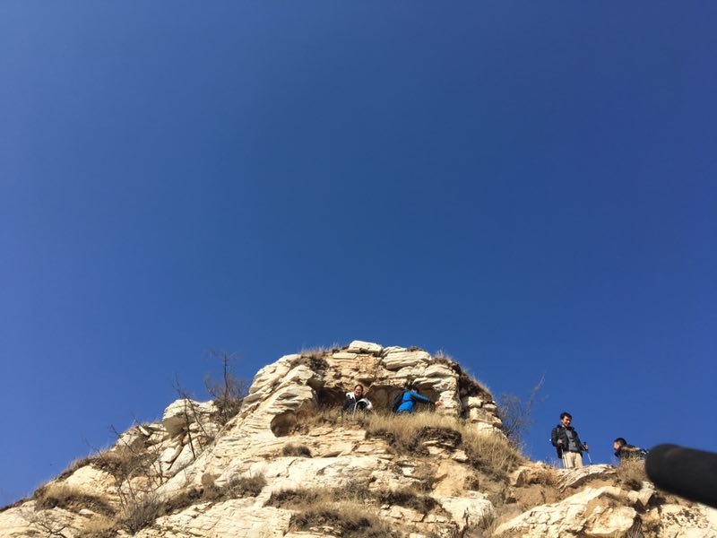 行走一段后,我们遇到了一个难题,去往五指山需要围着一座山绕行一圈的路程达到,此时已是下午1点,领队发现另一条岔路口,探路后,感觉这条路虽然能节省时间,攀爬却有难度比较陡,体力好的喜欢挑战自我的小伙伴可以尝试走此路,在此可以分成两队前进,一队绕行,一队爬陡崖直上。大家没有想齐声选择挑战爬陡山。