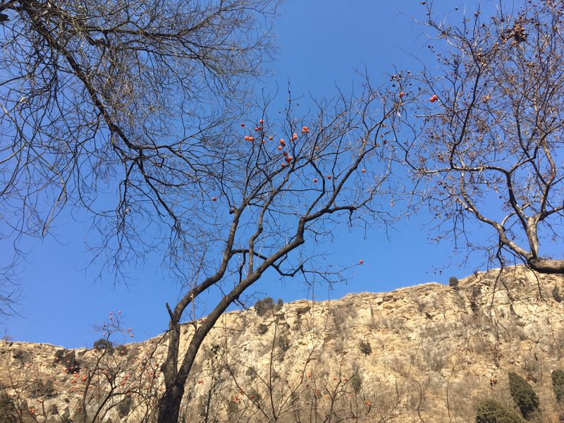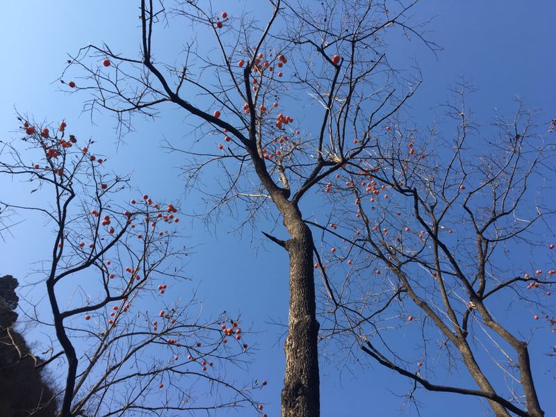 板城村是一个山村,村口对面有一条土路就是我们今天要登山的必经之路。我们沿着这条路进山,路的左边有零零星星的几棵柿子树,树上挂着不多的几个黄橙橙的柿子,有的女队友看着柿子想吃,一边看一边嚷嚷着要同行的男士去摘柿子来吃,男士们一看那柿子树足有5米高,回头对我们女队员说:“还是回家后到超市买点解馋吧,别劳民了。”我们大家都哈哈大笑起来。一路有说有笑的继续走着。