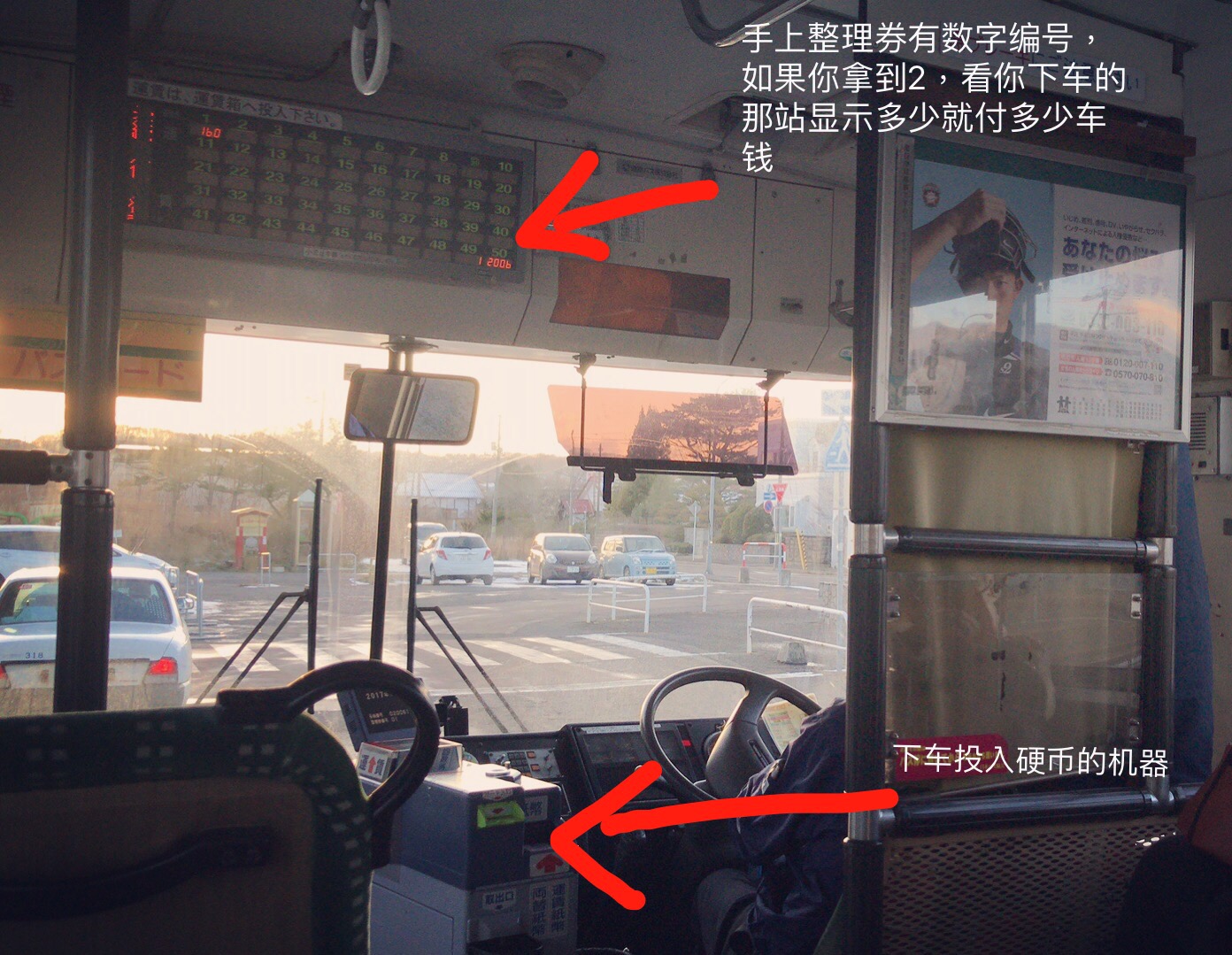 北海道大部分后门上车,旁边有个箱子拿“整理劵”,上面会有和数字编号,下车前一站记得按窗户旁边的车铃,灯亮后,司机便会在该站停车,不然巴士将不停车。如果有其他乘客已经按了同一站的按钮,就不需要再按了。巴士车内前上方都有电子显示屏幕,对照好整理劵的号码和司机左上方荧幕显示的车票价格表,对于听不懂日语的游客,注意一下站名就不会坐过站,下车时把钱和整理券一起投到箱子里去,准备好零钱,不要耽误周围的人(巴士前有零钱兑换机器,零钱不够的时候,提前在前部兑换)
