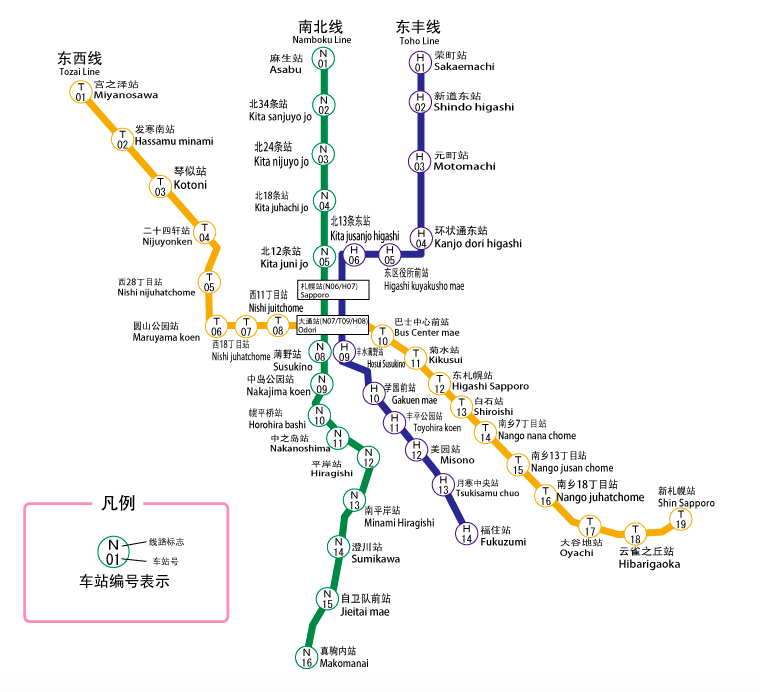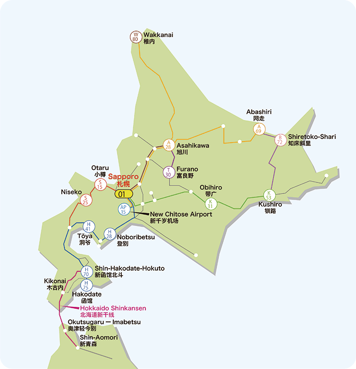北海道的交通主要有:⑴ 北海道JR铁路(城市之间的交通);⑵ 市区有轨电车;⑶ 巴士 ;⑷ 地铁;⑸计程车,这几种。