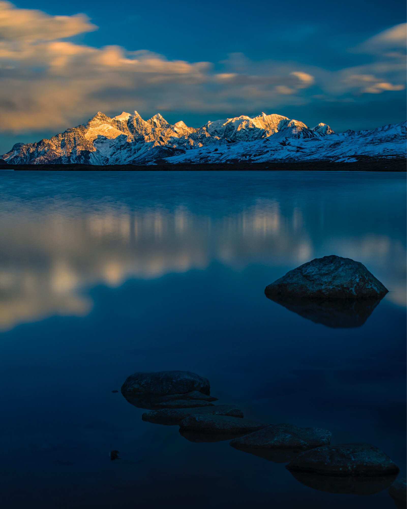 海子山自然保护区,有一个不大不小的高山湖泊,远处的贡嘎雪山近在面前,我和士官长一群人机位又站错了,站在岸边位置稍高,雪山的倒影仅让低机位的大哥拍到,而值得欣慰的事,我们等到了天边出现的玫瑰云。