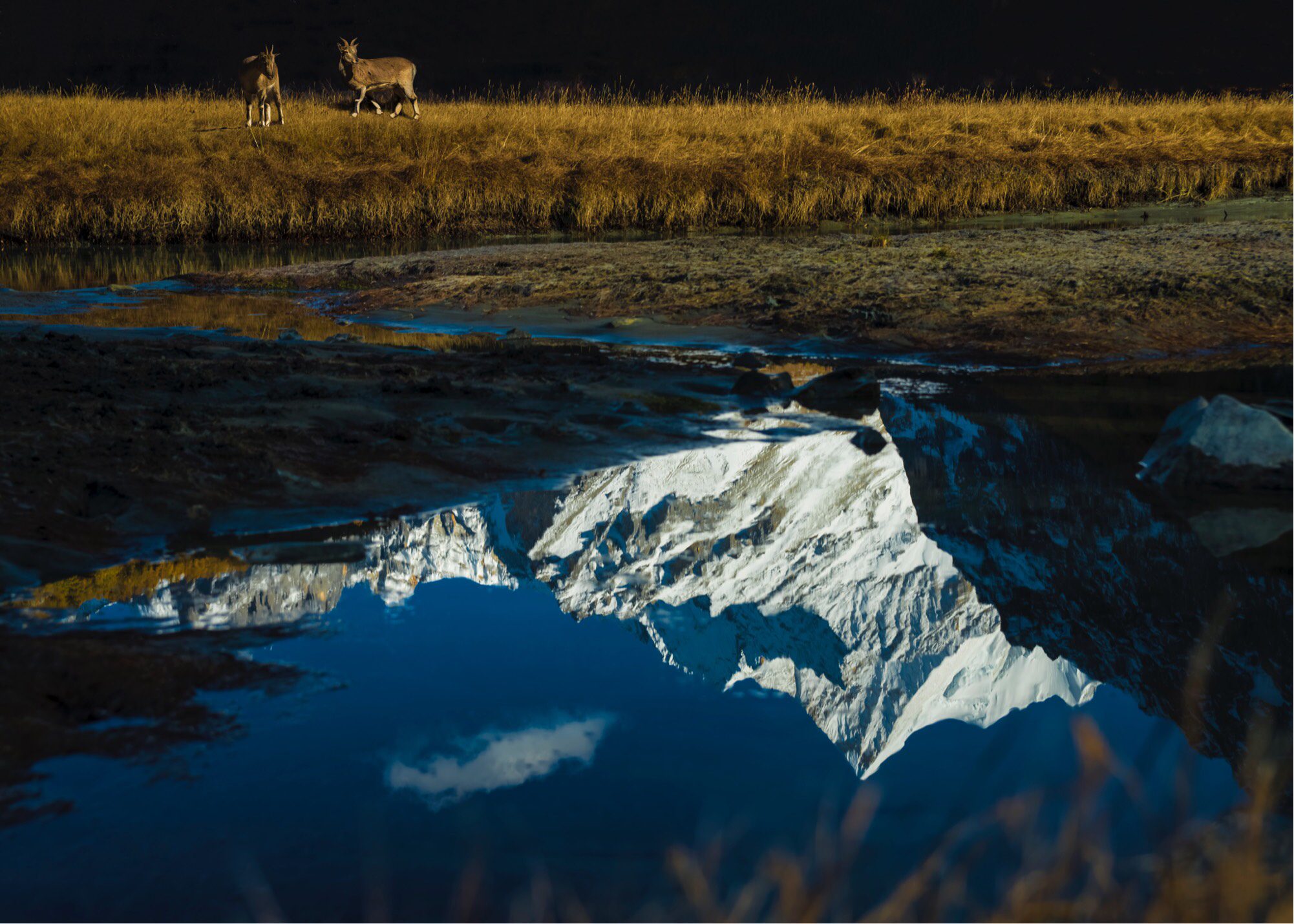 在冲古草甸上,一条雪水化成的小溪,静静地流淌在枯黄的草地上,小溪倒映着雪山,拍出来是那么的峻美。