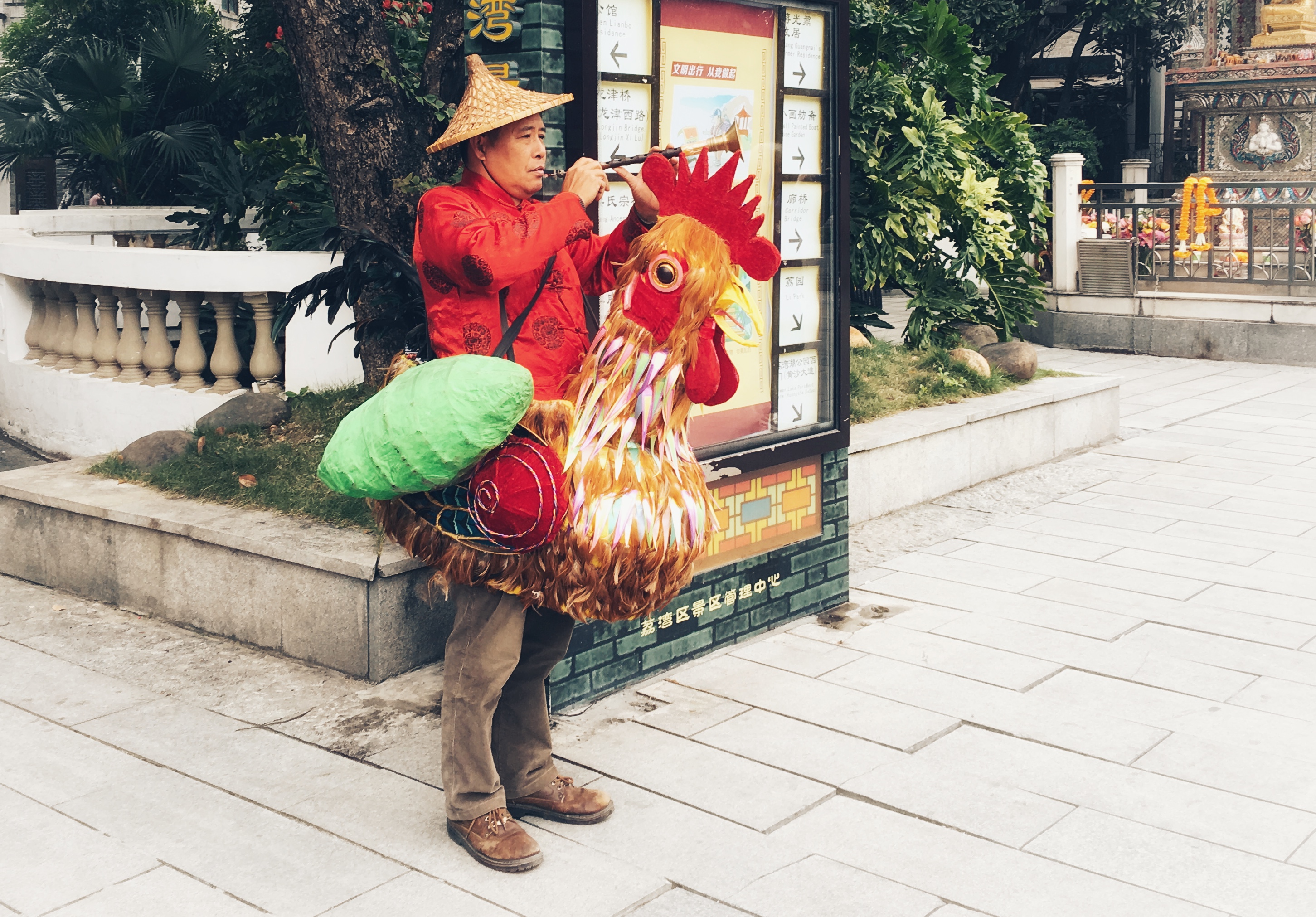 “嘀嘀嗒”的唢呐声在路上响起。我们闻声围过去,只见一只五彩缤纷的大公鸡模型,里面“装着”一位大叔,吹着唢呐叫卖腌榄。据说他所贩卖的“鸡公榄”,在上世纪二三十年代的广州,曾经风靡一时。