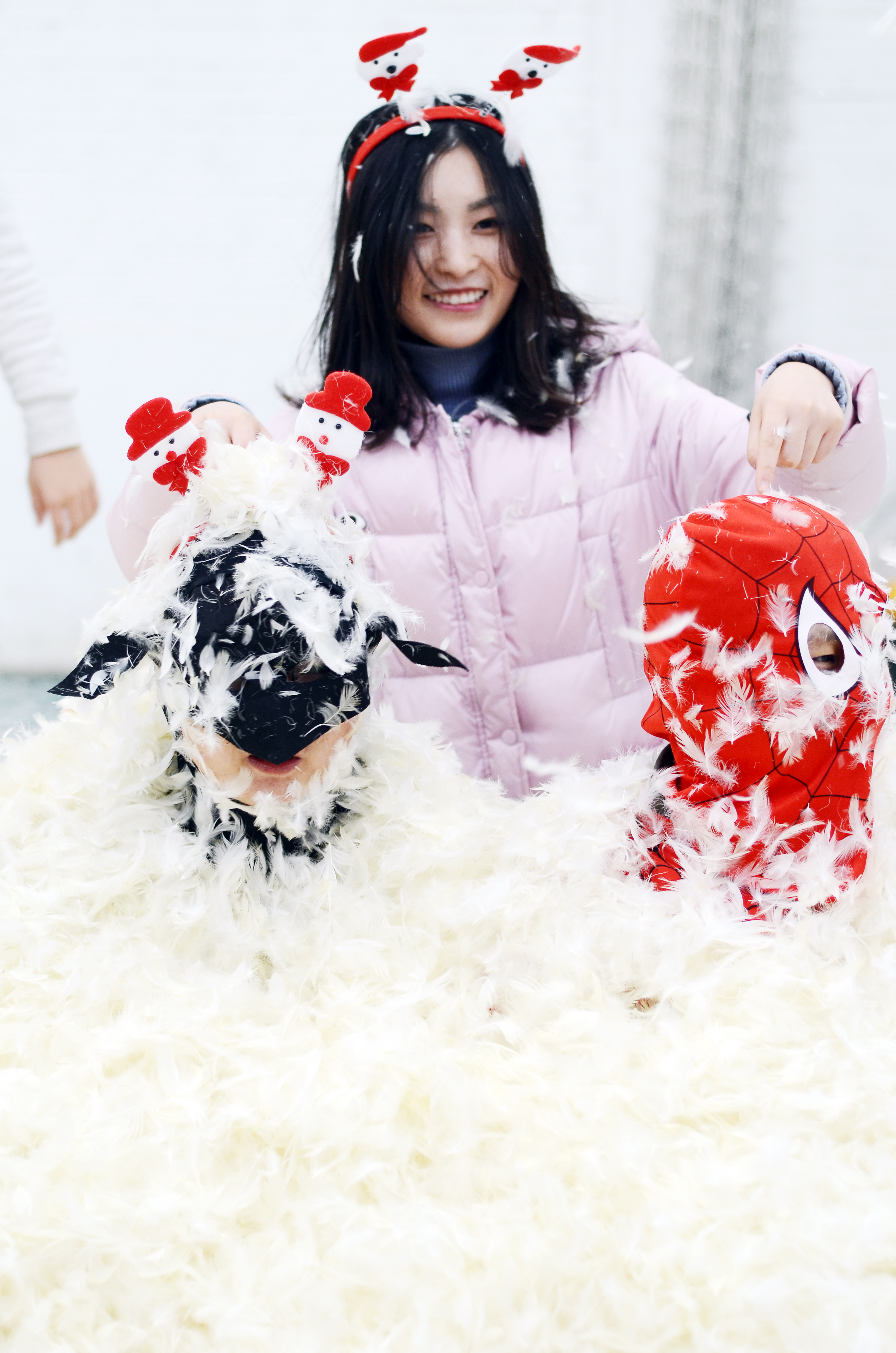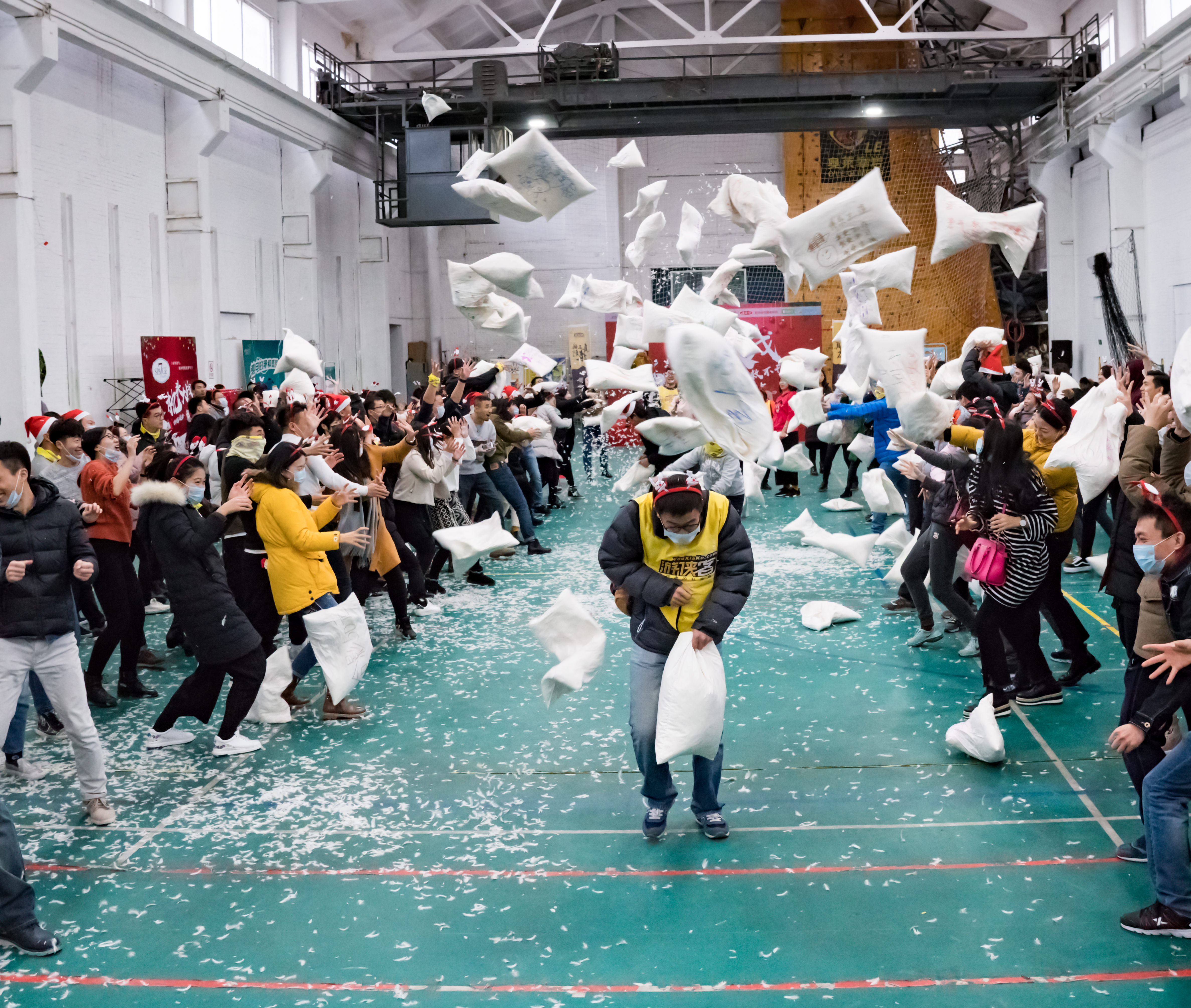随着时间的推移,距离“下雪”的时间越来越近了,故事的高潮就要开始了,事先堆积的枕头山被推翻以后,每人手上拎起了一只枕头,异常兴奋,血脉喷张啊,随着主持人的一声令下,大家相互拿着枕头追打了起来,最先遭殃的就是最亲近的人,兄弟反目,闺蜜撕逼,情侣互殴,就连最熟悉的陌生人也被殃及,大家都伸直了胳膊,抡圆了臂膀,将手中的枕头打向了别人,枕头里面的羽毛在被击打的瞬间,飞了出来,漫天飞舞的景象非常唯美,在背景音乐的伴奏下,大家都好像回到孩童时光,这一刻每个人都登上了属于自己的战场