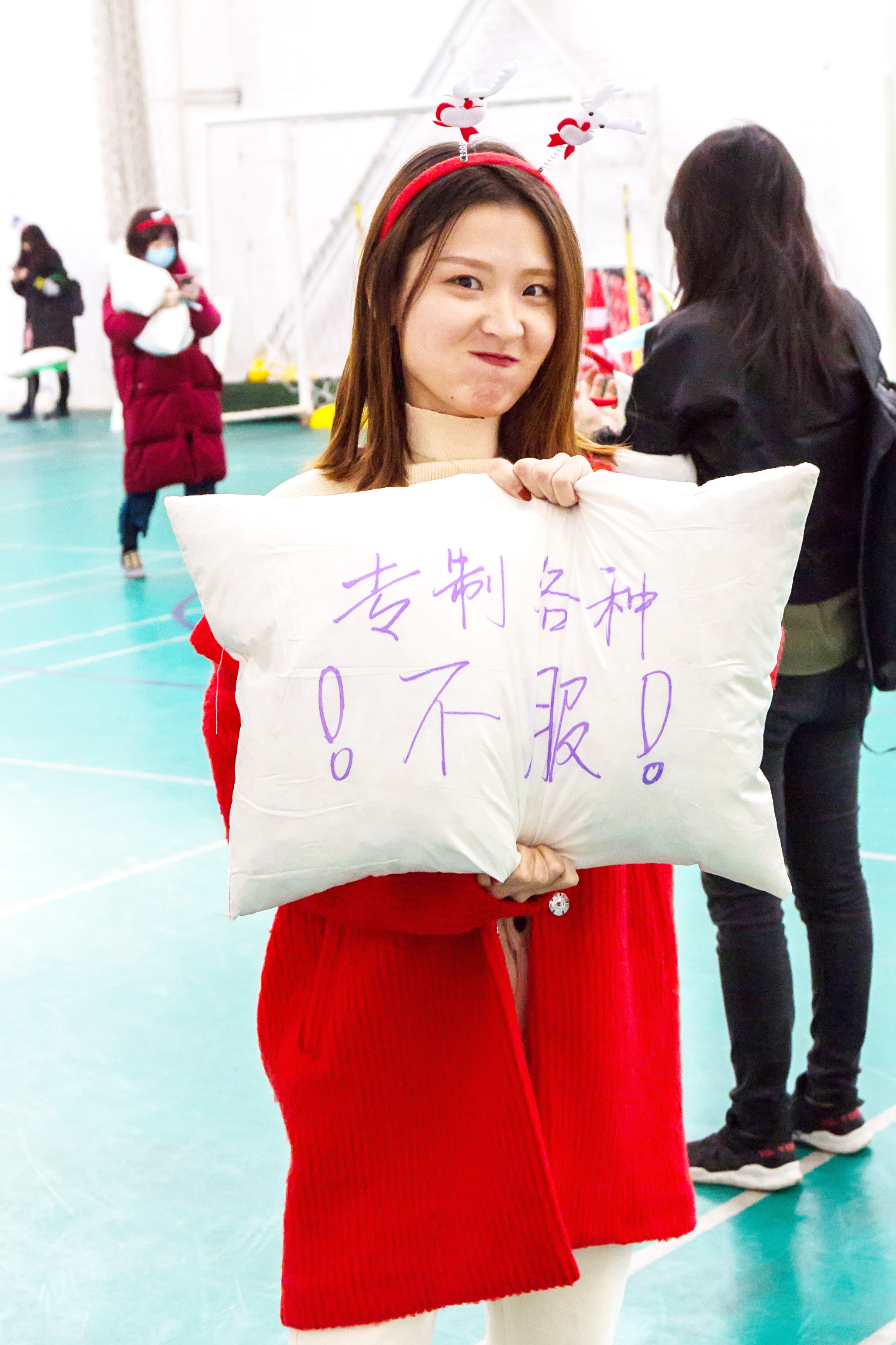 随着音乐的变换,顿时欢快,激情的氛围营造而起,在场地中央主持人的号召下,大家一会围绕场地四周旋转,一会儿三五成群蜂拥而抱;一会儿拉开排场,两队相视二站,拿起手中的枕头,像抛手榴弹一样地扔向了对面的人群,被砸的人不但没有不开心反而像被钱砸到了一样,呵呵一笑,捡起地上的枕头随后反击更狠地扔了回去;只见枕头像充了氮气,飞来飞去,完全像开了挂;休息片刻,宅男、土豪、高帅富分在了一起,萝莉、女神、白富美分在了一起,他们也分为两队,相视而站,女生拿起画笔在手中的枕头上写上了自己的联系方式后,瞄了下对面的汉子们,然后将枕头丢了过去,这俨然是将枕头当做了绣球啊,可谓是现代版的抛绣球了;顷刻,不知怎地,一群人排开一字长蛇阵,另一群人从 他们中间穿过,接受着枕头的洗礼,不知道被两边的人用枕头蹂躏了多少下,打的人是开心的,被打的人也是开心的,力的作用是相互的,快乐也是可以这样传递的;具体画面呈现如下图
