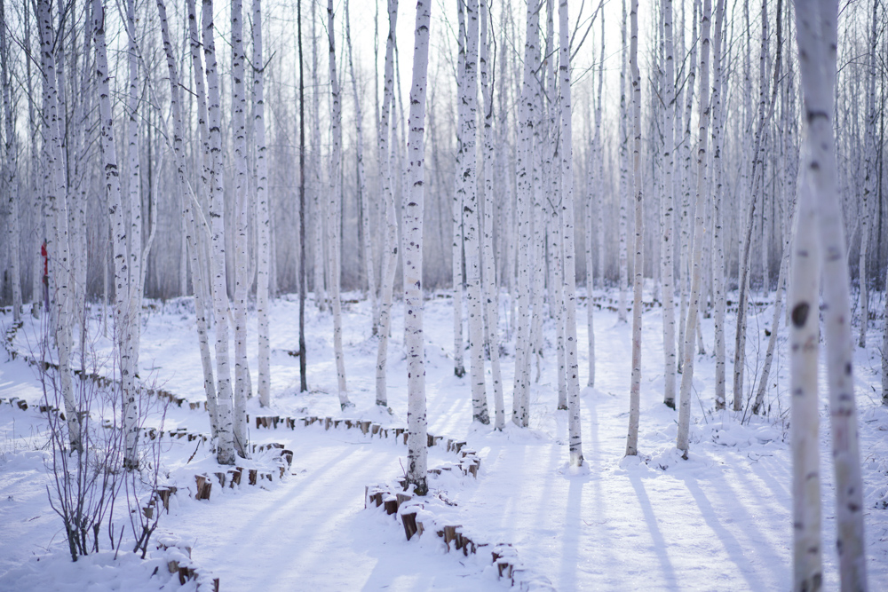 冬季来临,白桦叶子落光,在白雪覆盖的大地衬托下非常好看