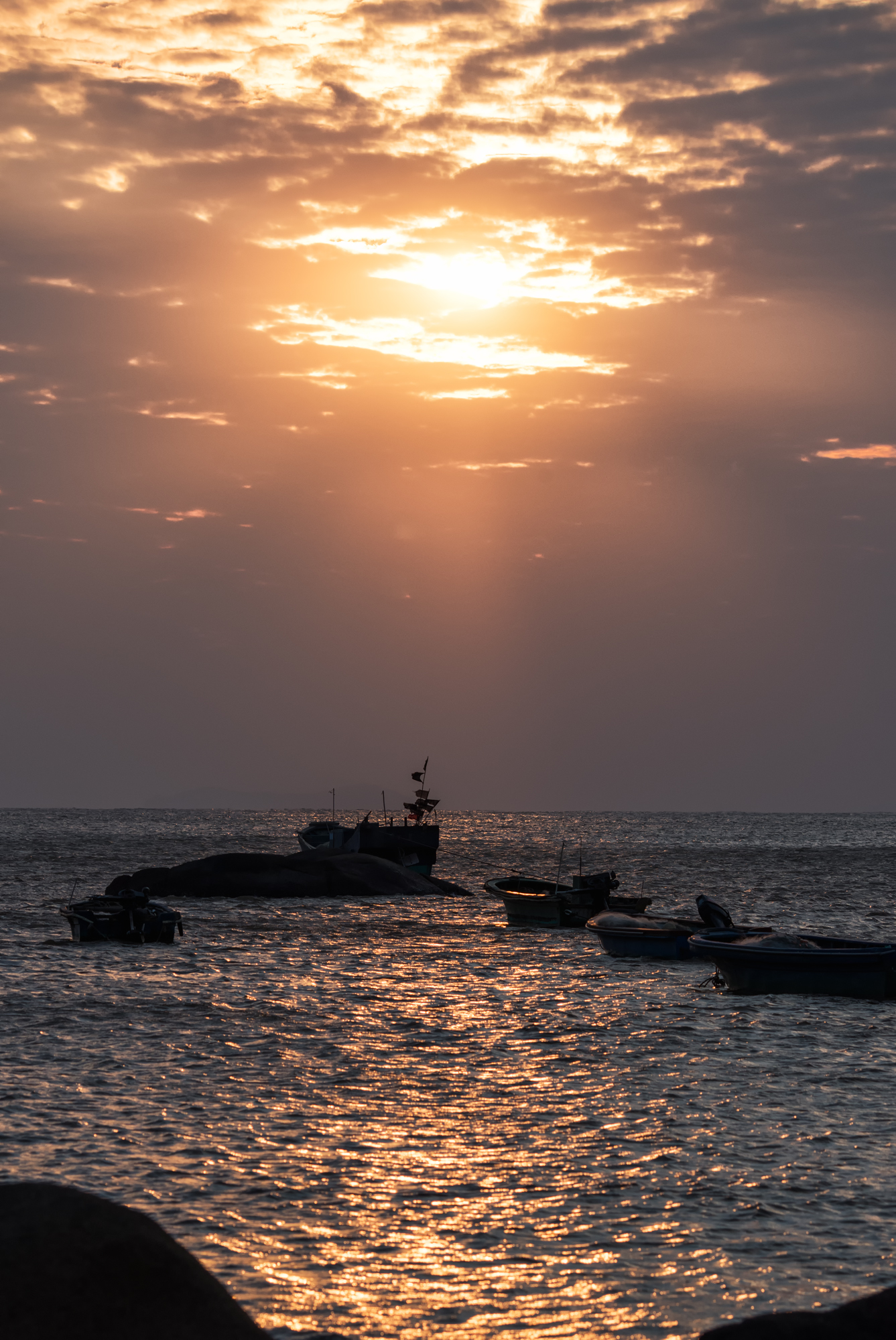 此时的太阳已经落下,天空渐渐暗淡,大多数人选择打道回府,只有少数人继续等待。果然,天空渐渐泛起紫红色的晚霞,染红了天边的云彩,我便用70mm镜头横排5张接片,记录下渔舟唱晚的景象。