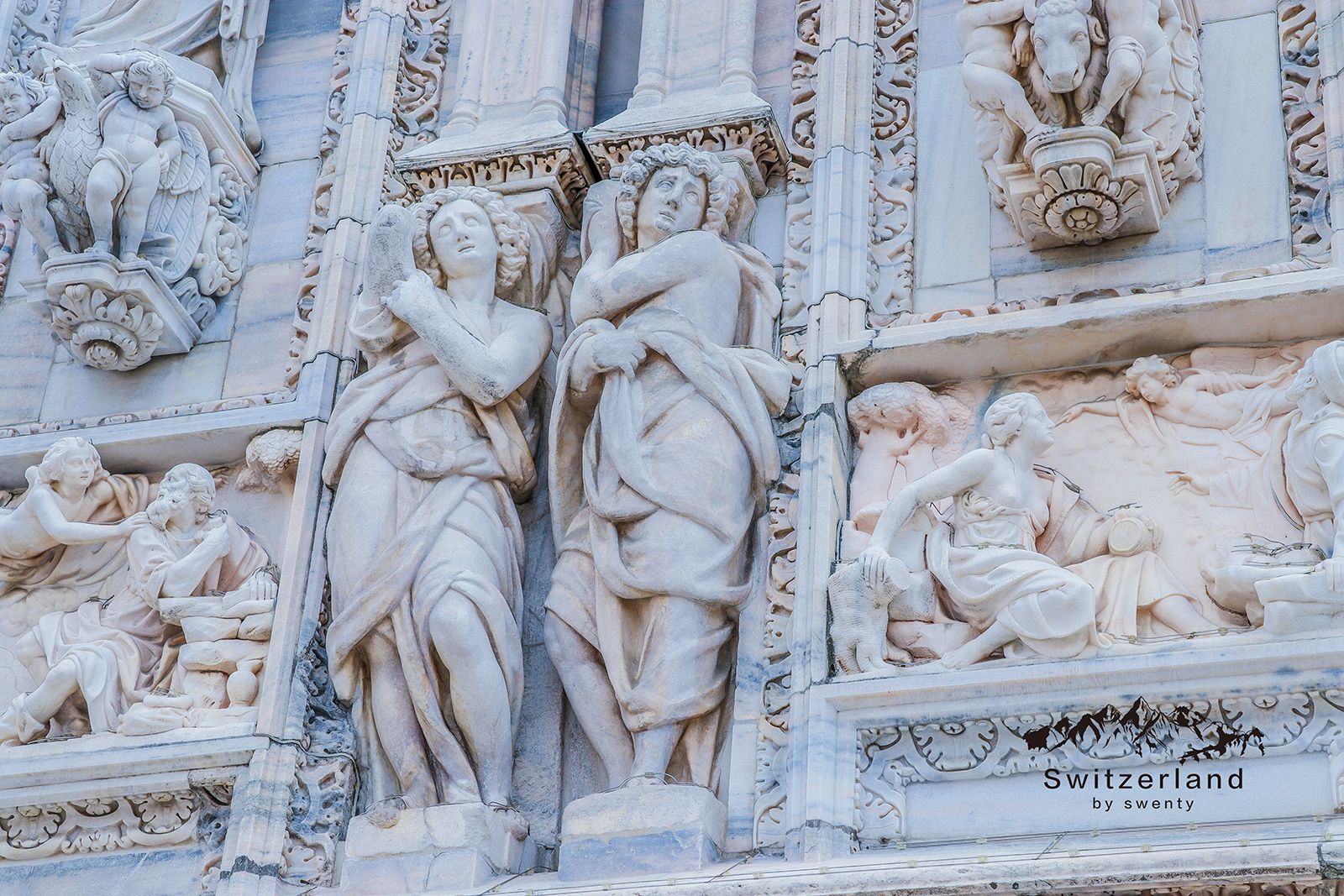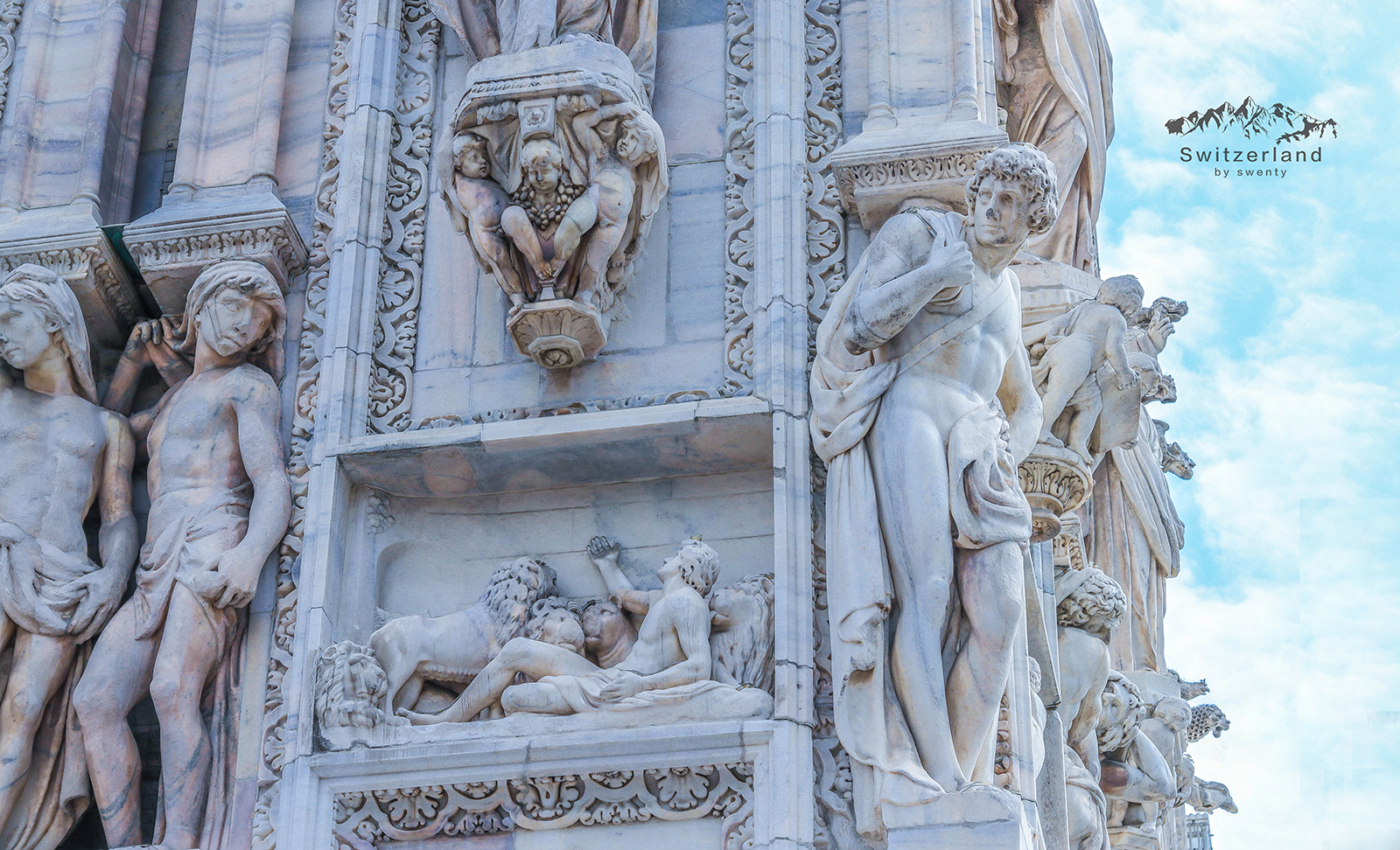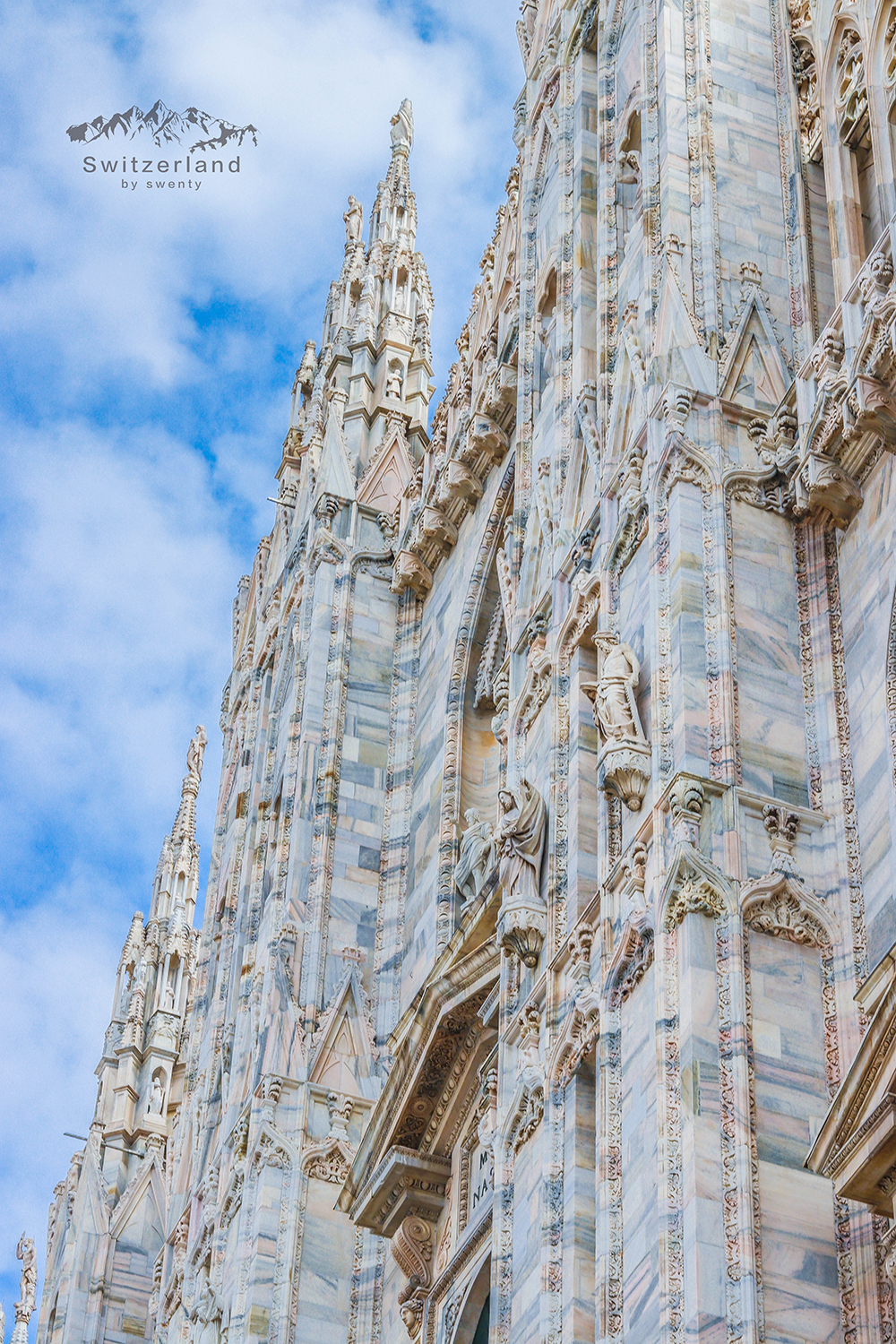 米兰大教堂整个外观极尽华美,连教堂天顶的地板也是用白色大理石砌成的,马克·吐温称其为“大理石的诗篇”。 雕刻和尖塔是哥特式建筑的特点之一,米兰大教堂可以说是把这个特点表现的淋漓尽致~