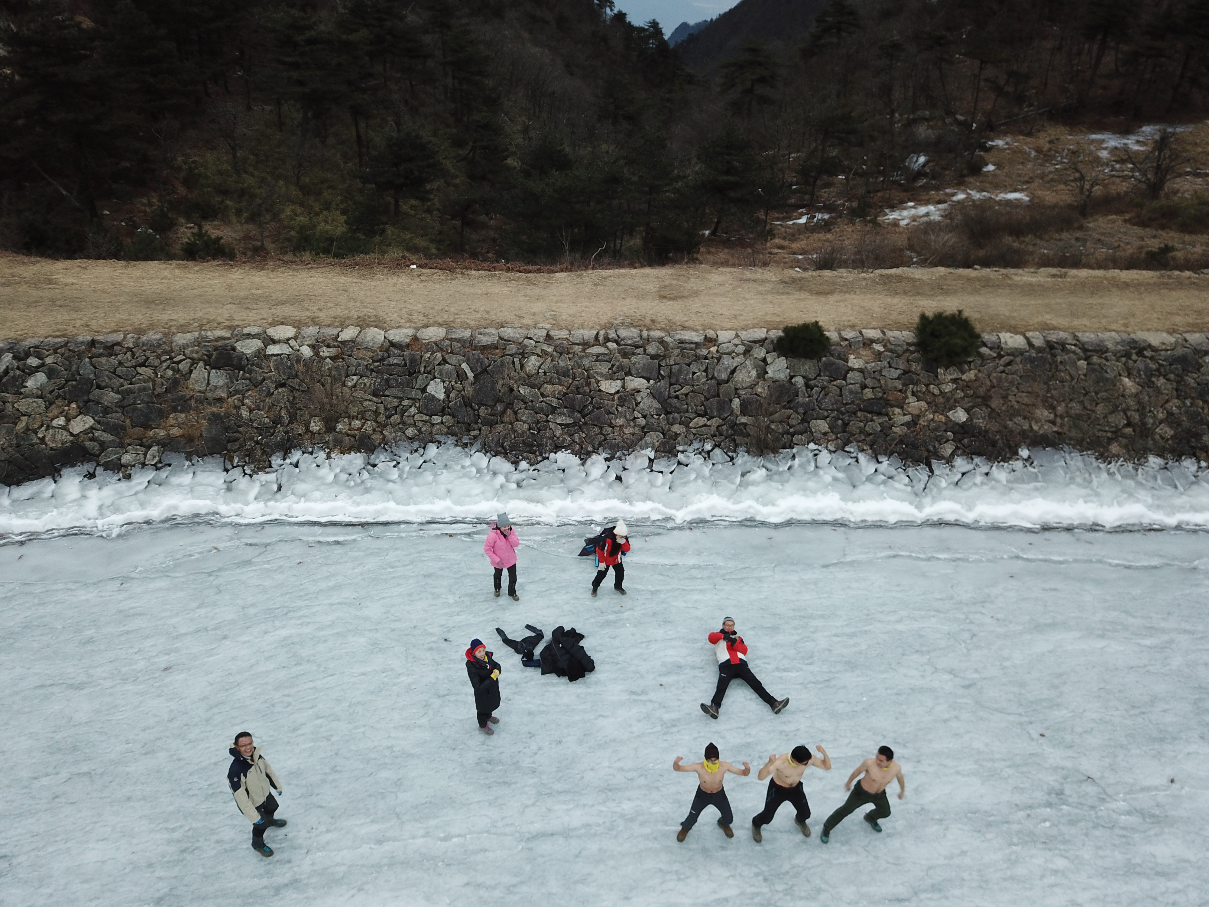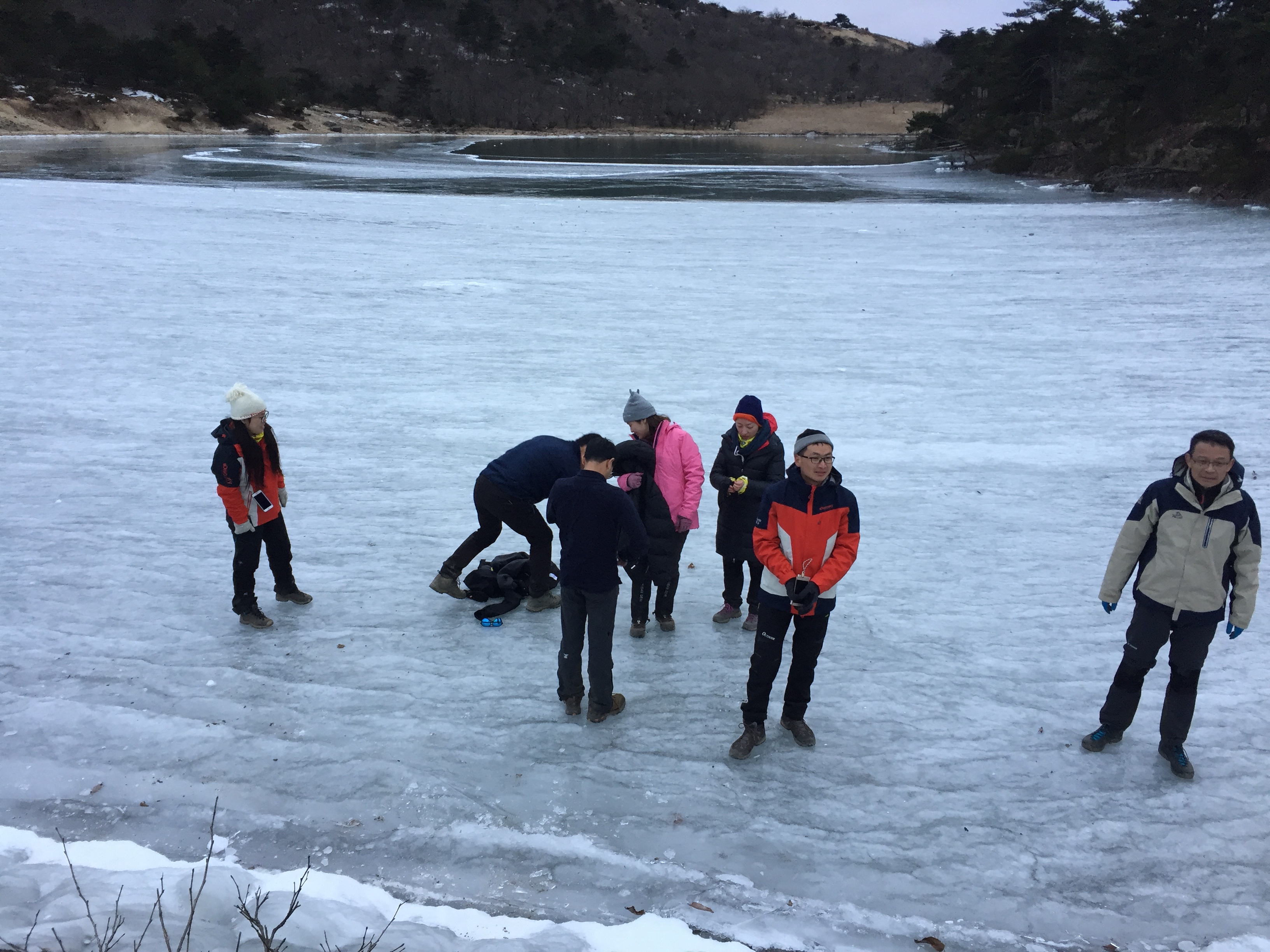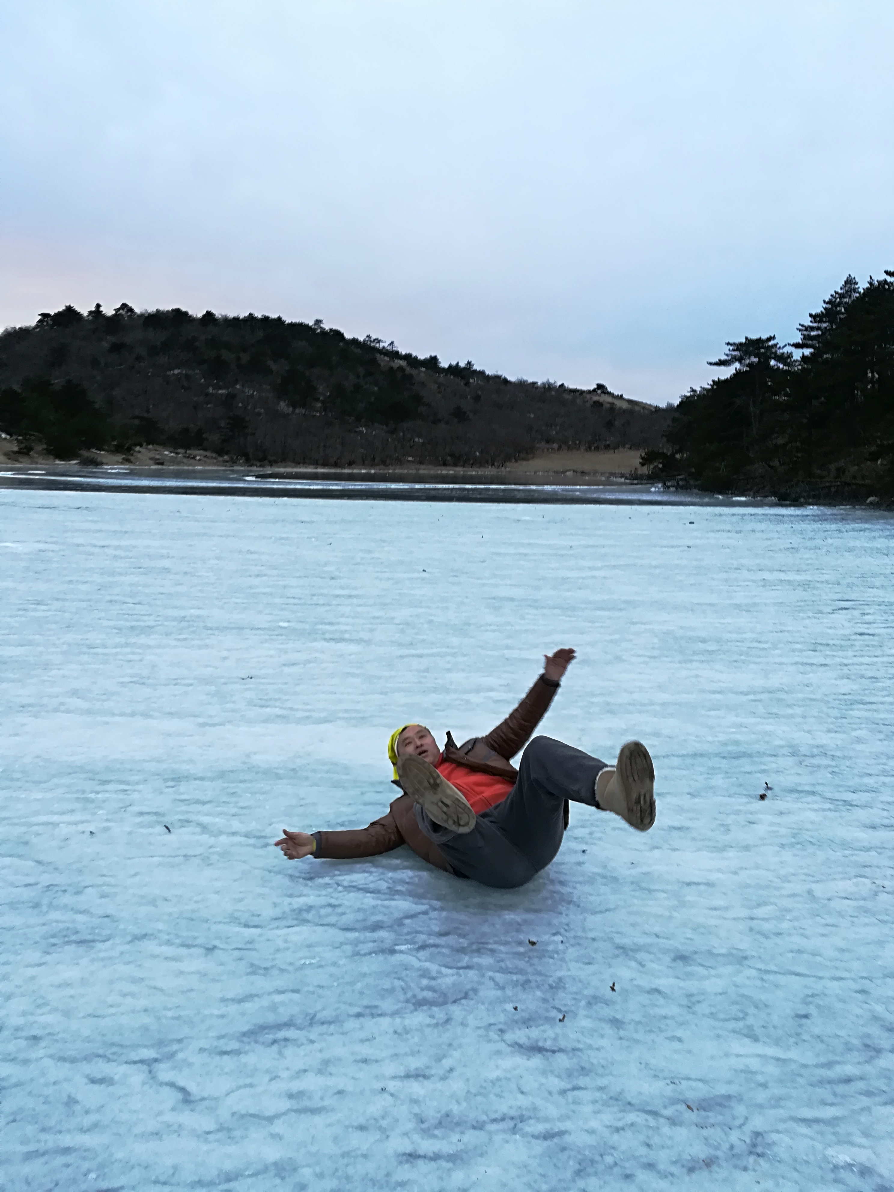 欧阳锋教的蛤蟆功终于派上用场了。(在冰上玩耍的你们,不怕我把冰震裂吗)