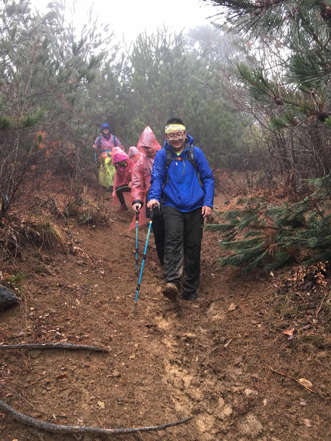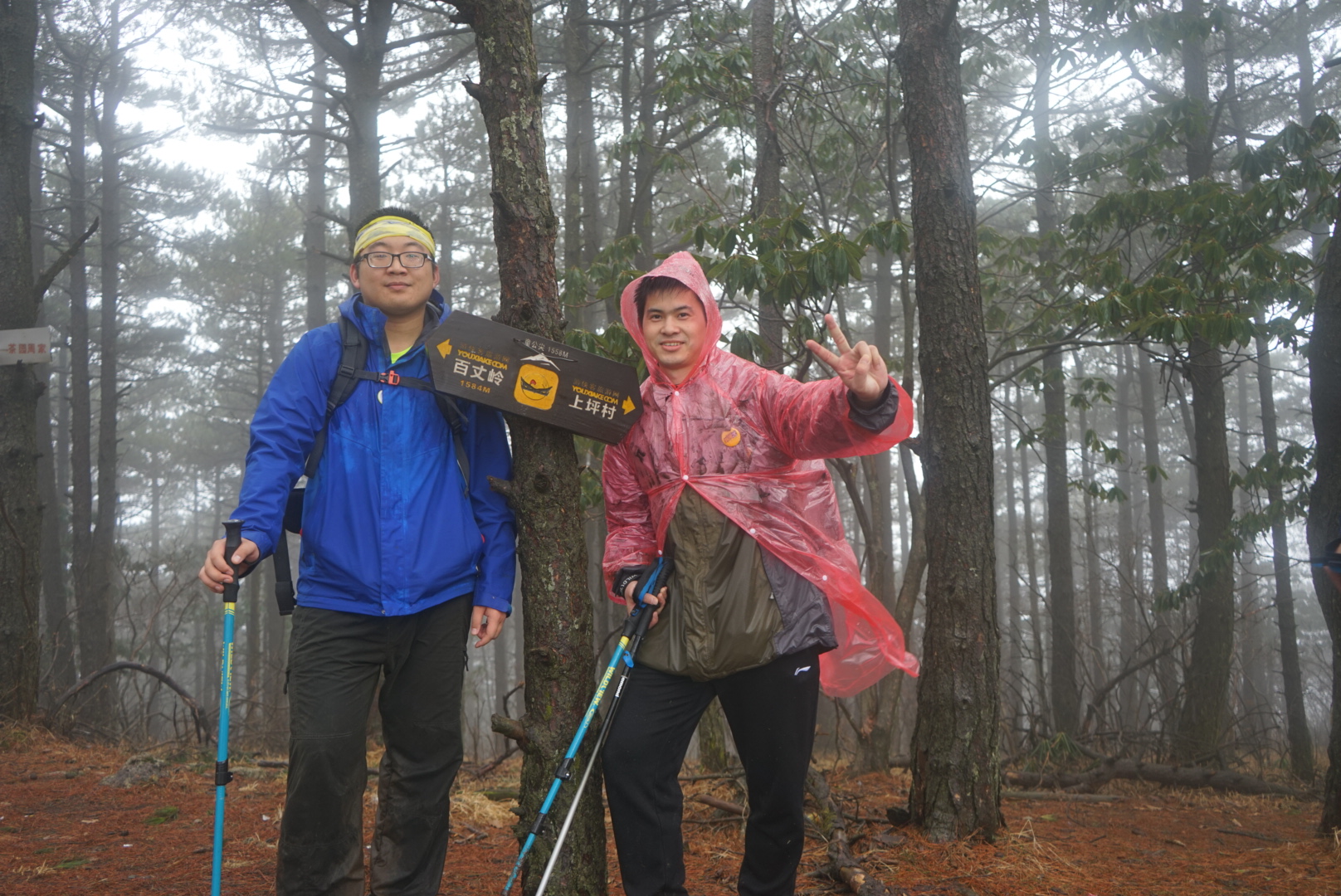 享用过“饕餮大餐”,青空开始飘下细雨,大家纷纷拿出雨披,之后的上山路还算好走,大家在风雨中顺利登顶。