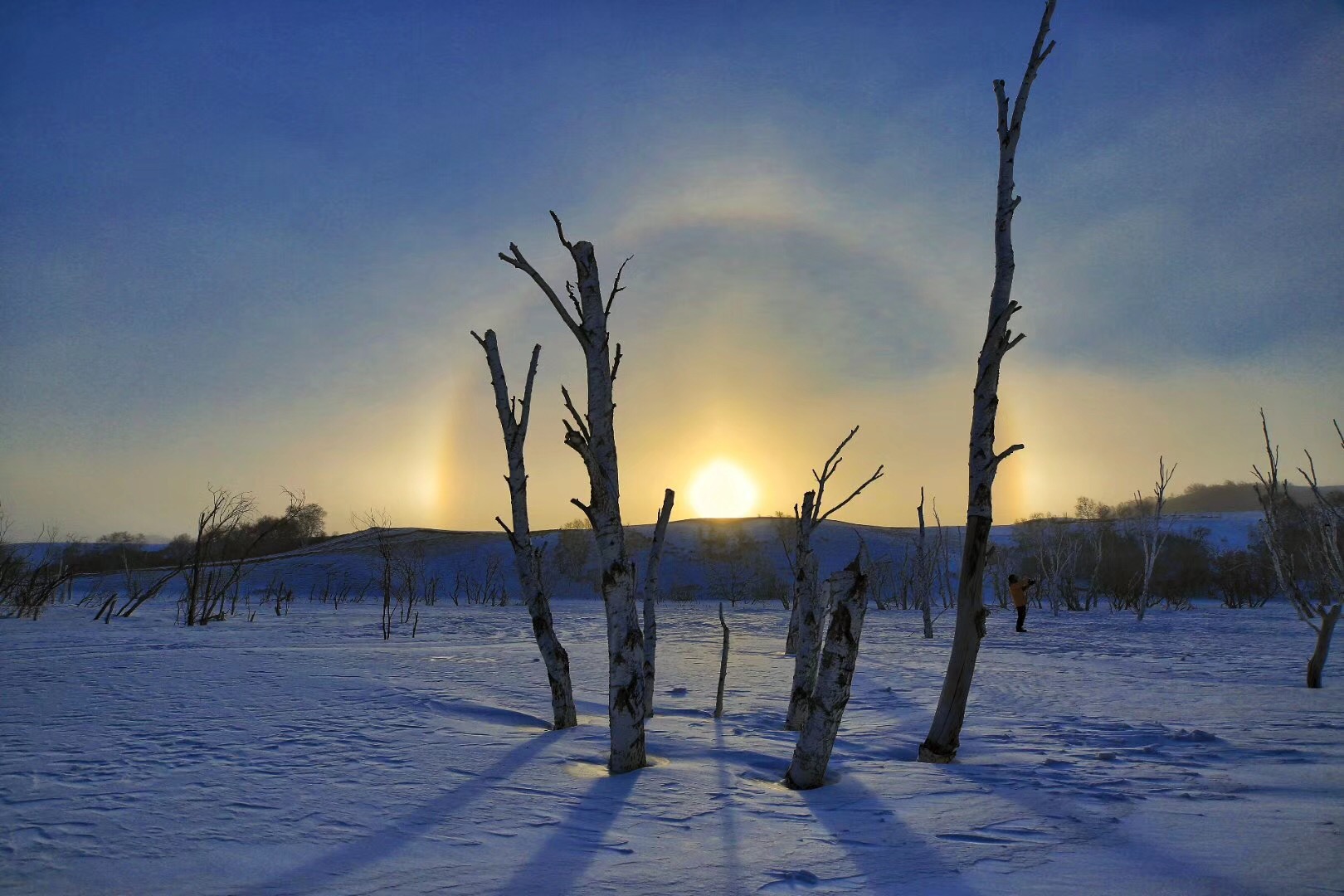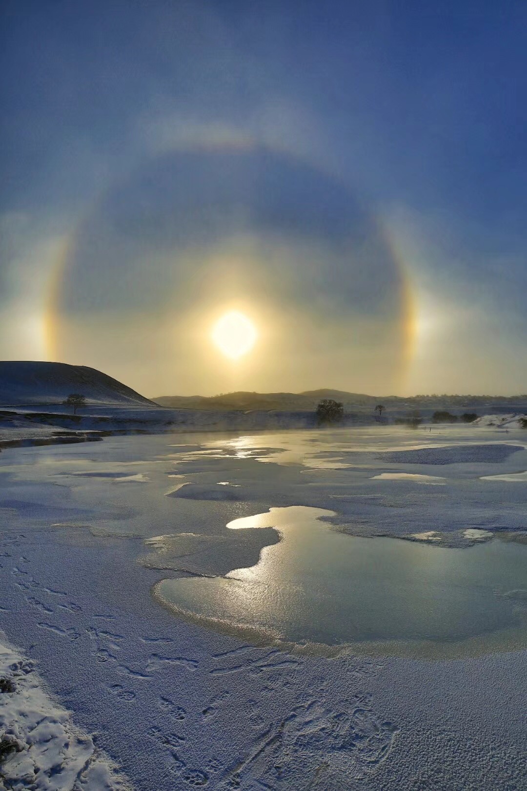 幸运的遇到日晕。于是我们的洒水成冰的照片必须拍起来。