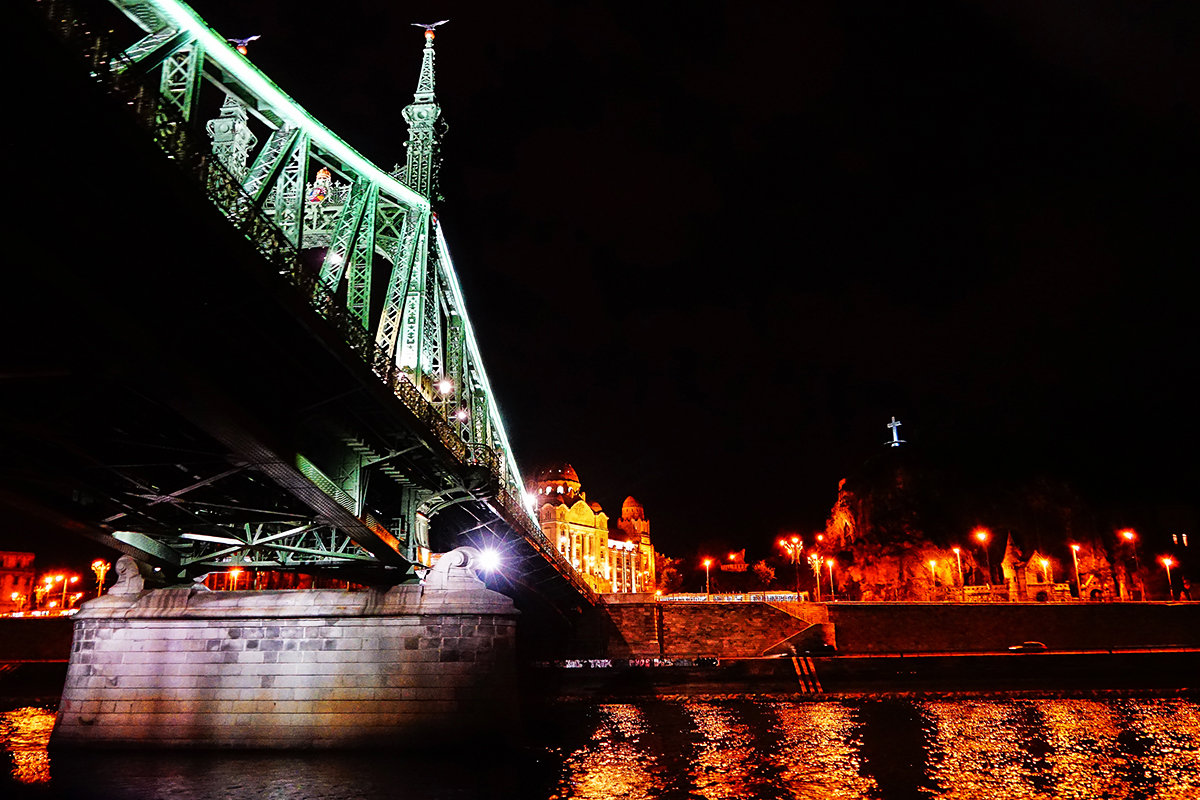 自由桥位于茜茜公主桥以西,是布达佩斯多瑙河上建设的第三座桥梁, 桥两端石墩上有两对铁塔式建筑, 塔尖栖息着图鲁尔鸟(匈牙利历史上一种神密的象征)和优雅的钢桁架梁更增添了它的美景。 这座桥原名费伦茨—约瑟夫桥,以茜茜公主的丈夫约瑟夫的名字命名,落成时约瑟夫曾经亲自剪彩,打下了最后一颗铆钉。该桥呈绿色,与它西边紧靠的白色的茜茜公主桥统称为夫妻桥。二次大战后布达佩斯将此桥改以“自由”的现名。看来匈牙利人民对茜茜公主比对她的丈夫要有好的多,茜茜公主桥建成后从未改名。