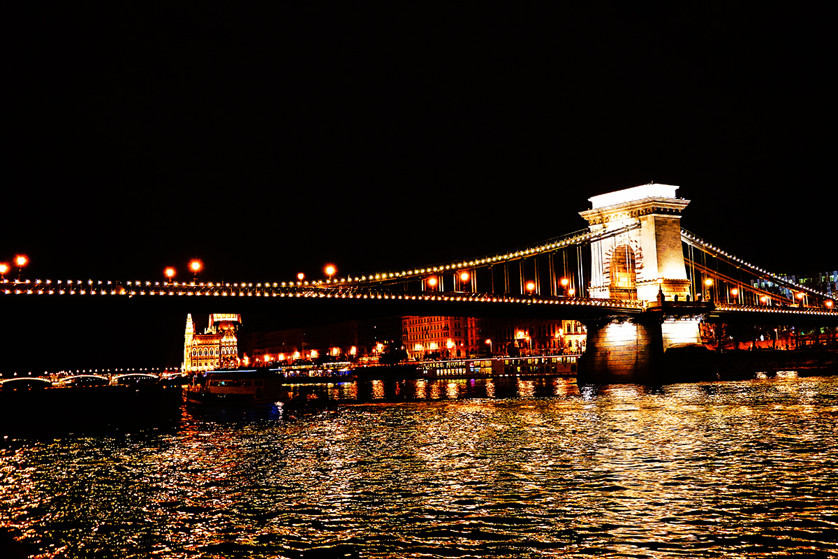 链子桥堪称布达佩斯最著名的城市标志。这座桥建于19世纪,是连通布达和佩斯的九座桥梁中最古老、最美丽的一座。桥身上色彩斑驳,桥头的狮子造型刚毅雄伟,还带有一丝历史的沧桑感。每当夜晚降临时,两侧桥身长长的灯串闪烁着黄金般到璀璨夺目的光芒,远远望去仿佛一条悬挂在沉沉黑幕中的巨链,是许多游客神往的地方。 链子桥是座三孔铁桥,二次大战期间德军为了巩固他们在城堡山上的堡垒,将桥梁全部炸毁,历经战后的重建,链子桥在完工后的一百年即1949年重新通行。桥的布达一端有垂直缆车可登上城堡。正如塔桥是伦敦标志一样链子桥多年来一直是布达佩斯的象征。在桥的两端各有一对狮子雕塑,有匈牙利设计家亚诺士1850年设计而成。四支狮子的爪子紧紧抓住两岸,象征布达佩斯紧紧相连。