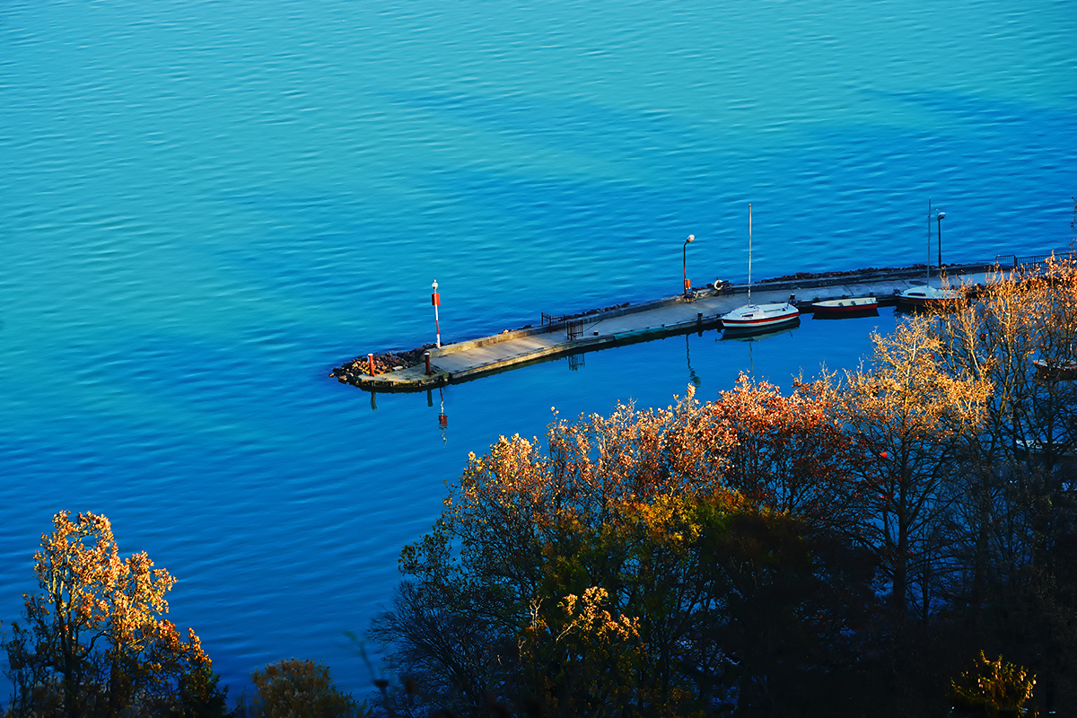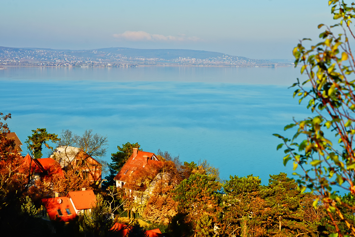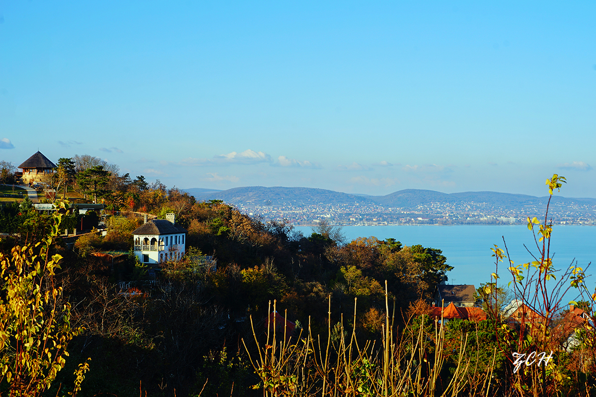 据说,巴拉顿湖水的颜色随着天气的变化而改变:阴天时是深绿色的,日落时分是宝蓝色的,阳光灿烂时是奶绿色的,难以捉摸却总会给人带来意外的惊喜。距离较近,我就多掐几张湖光山影,留作纪念罢了。