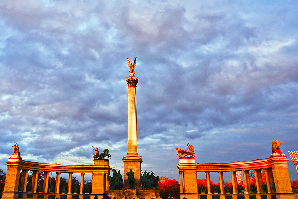 我们的大巴车沿着布达佩斯最美的安德拉什大街向前行,大街两旁的漂亮建筑在眼前飞掠而过。大街尽头处的英雄广场,是1896年为纪念匈牙利部落民族到欧洲定居1000年而修建的。 英雄广场是布达佩斯最宏伟的建筑群之一,有极高的历史、艺术价值。也是为庆祝匈牙利建国1000周年而建,来纪念经战争浩劫的匈牙利人民和民族英雄。广场中央立有36米高的纪念柱,纪念柱基座上雕着匈牙利马扎尔民族英雄阿尔帕德王子和6位族长的骑马像,广场两侧分别是匈牙利艺术馆和美术馆。