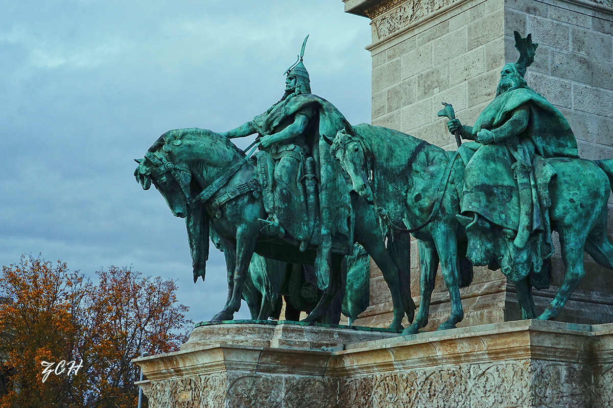 千年纪念柱上的大天使。纪念柱顶端是大加百利天使雕像,加百列手持加冕王冠,威风凛凛。铜塑纪念柱基座上是阿尔帕德王子和6位族长的骑马雕像。纪念碑的底座上有七座匈牙利祖先马扎尔民族部落首领的雕像。