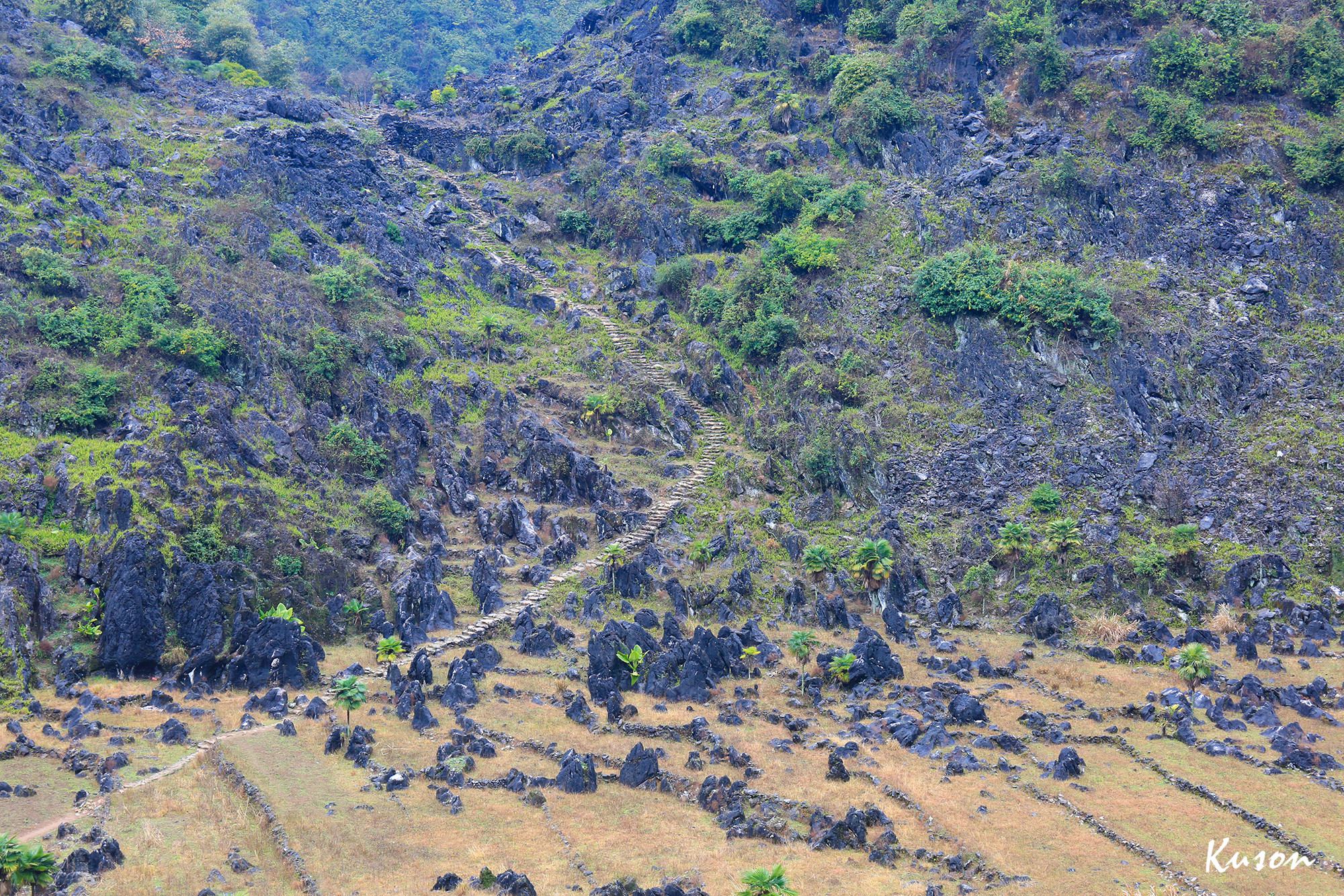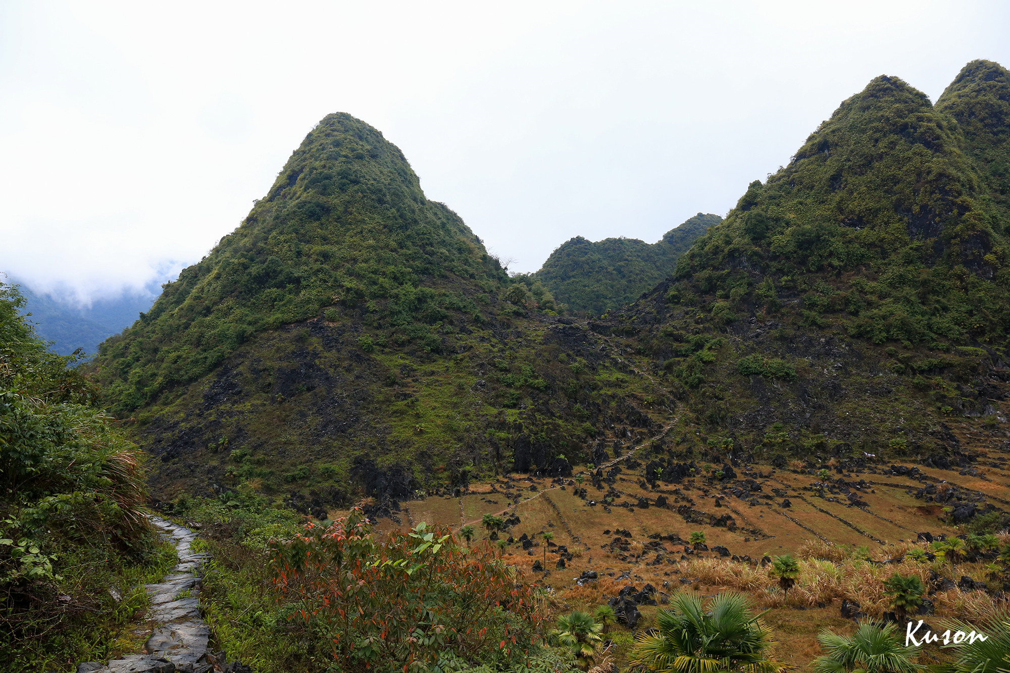 古道有时在低矮的峰林中迂回,高处下望,极为壮观。