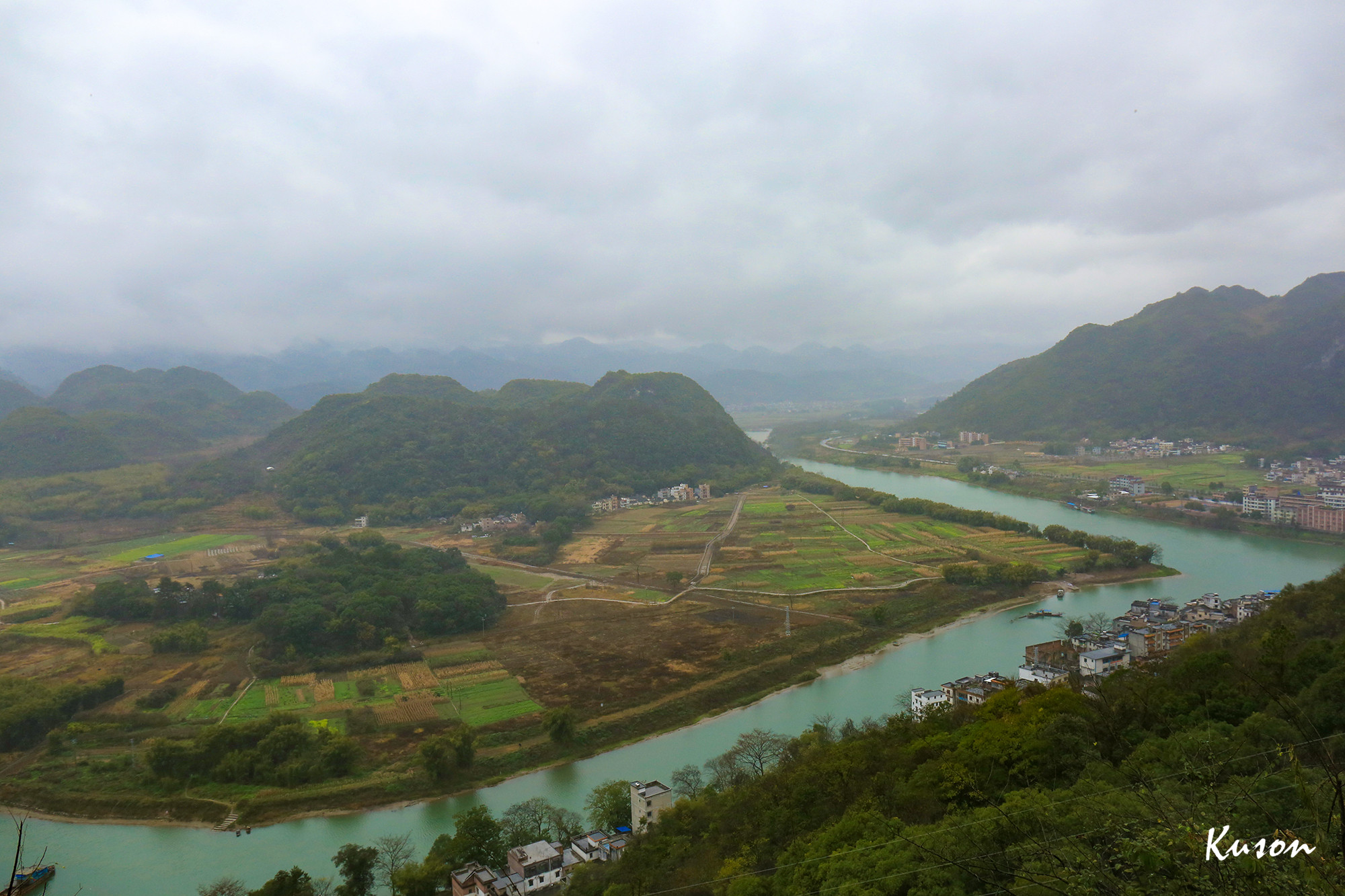 在登山口的半山俯瞰连江画廊,曲折蜿蜒的连江开始分流,这里是省内少见的山水风景画廊,也有着广东的小桂林的美誉,这次遇到下雨天,但也同样的迷人。