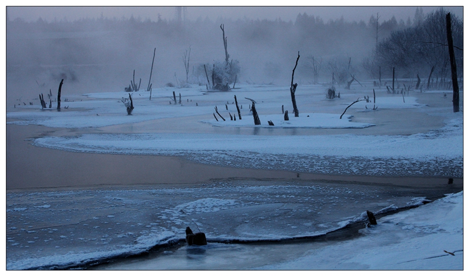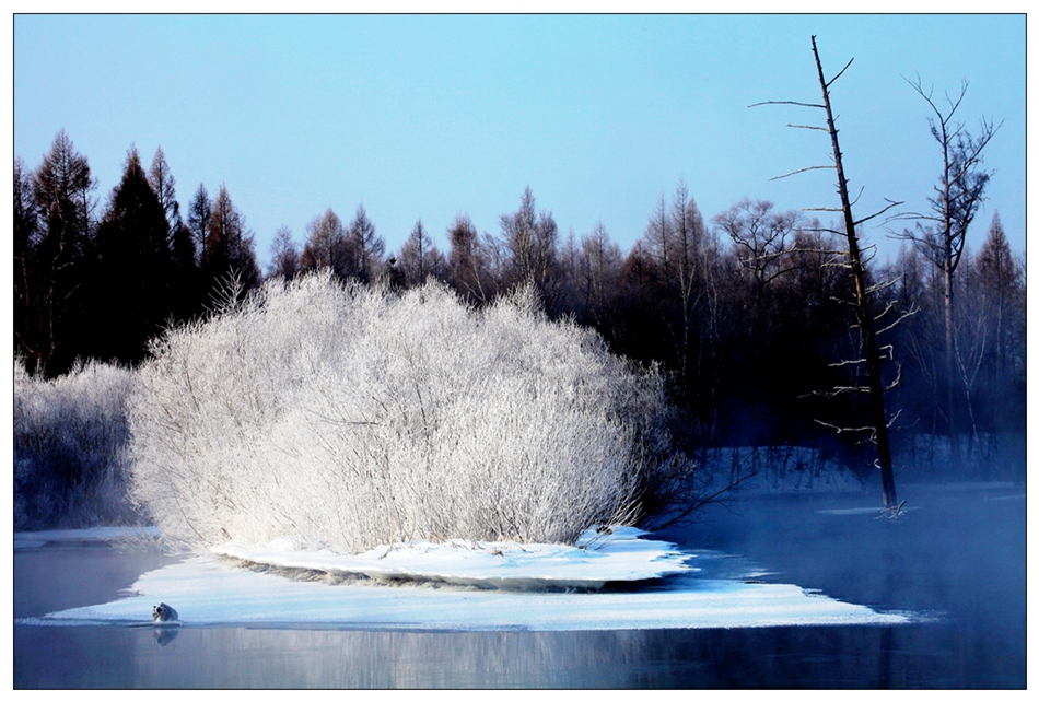 冬天, 每当气温到零下20度时出现的雾凇,忖映着河中那些枯树。。。寂静而神秘,恍然到了“魔界”!