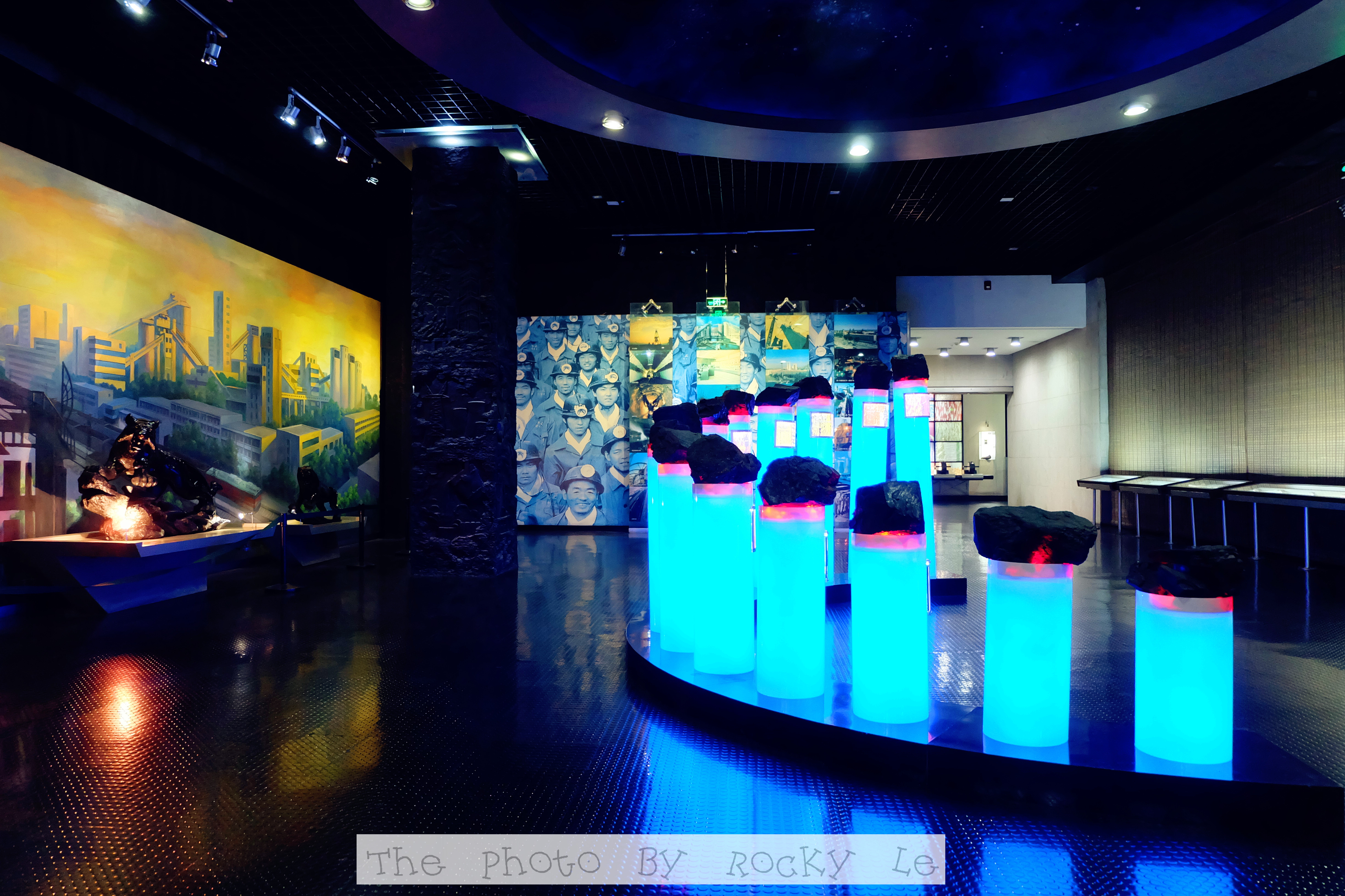 每根立柱上都陈列了一块煤炭,依据变质程度及工业用途的不同,将煤炭分为三大类十四种。三大类是:褐煤、烟煤和无烟煤。褐煤的含碳量最低。。。我也就记住这些了