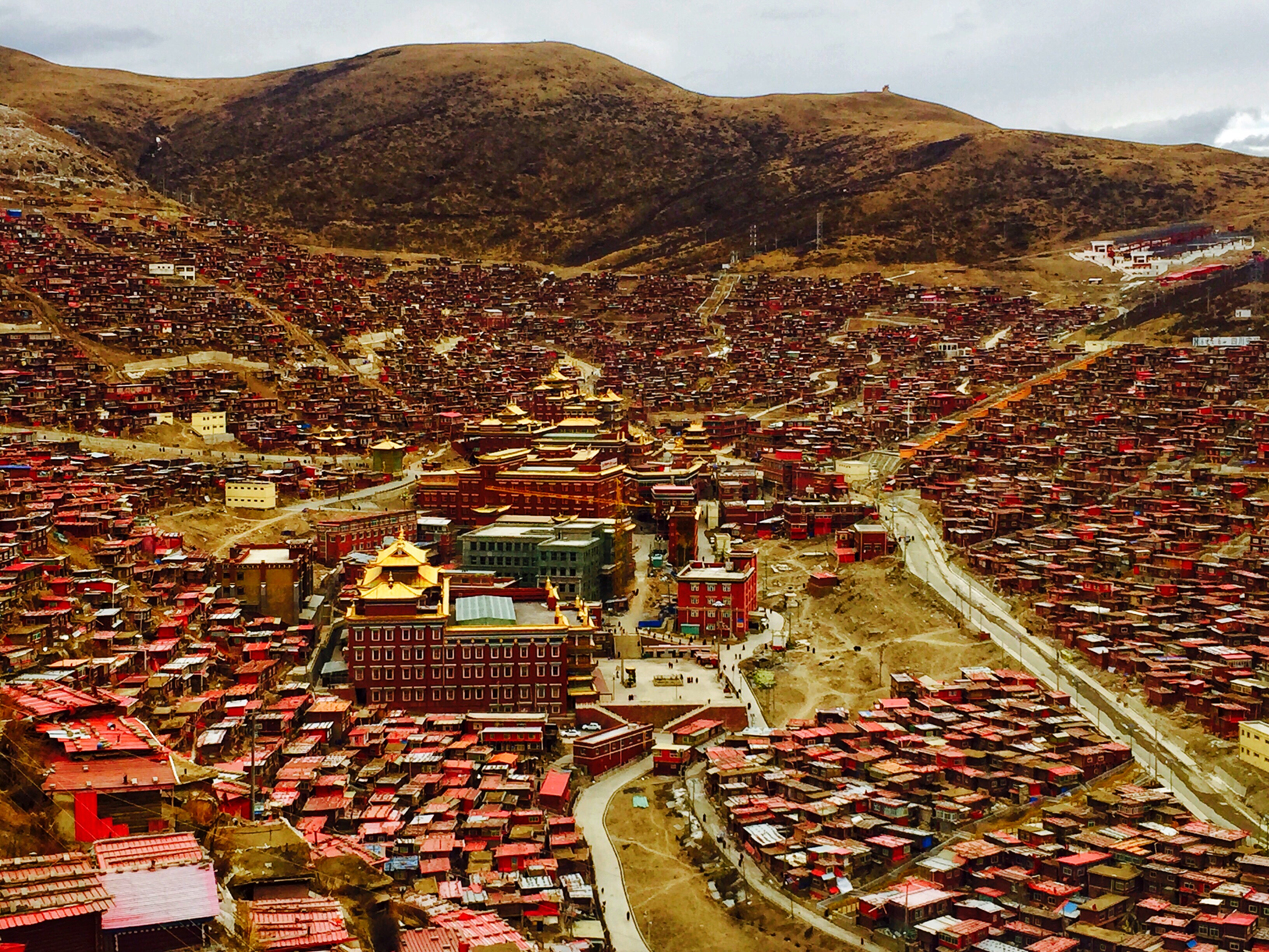 今天直达色达喇荣五明佛学院,海拔渐渐升高,路途也颠簸、弯曲;辛苦我的团友了,几个人都晕车了,也有了轻微的高反;到达佛学院辗转做大巴到山脚,再克服高反缓慢的一步步向佛学院观景台徒步;