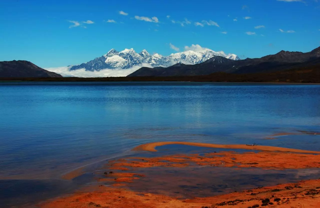 夏季湖边然乌湖绿草茵茵,山腰则是灌木丛林,五颜六色的杜鹃花怒放,山顶则是终年不化的积雪,湖水碧波粼粼,风景如画。