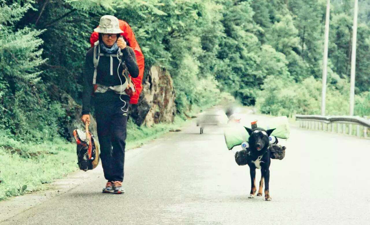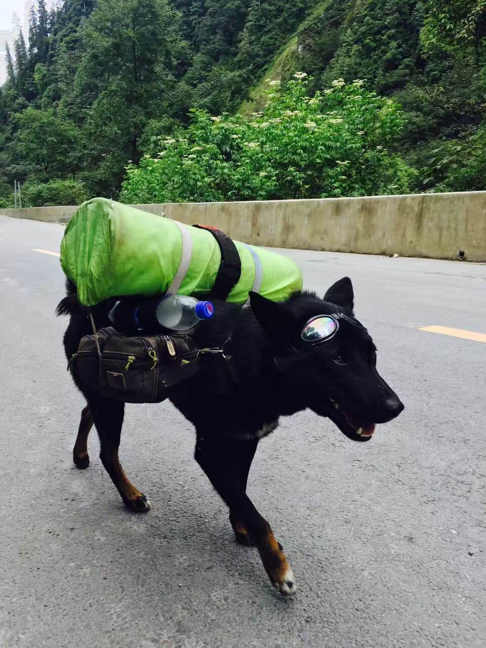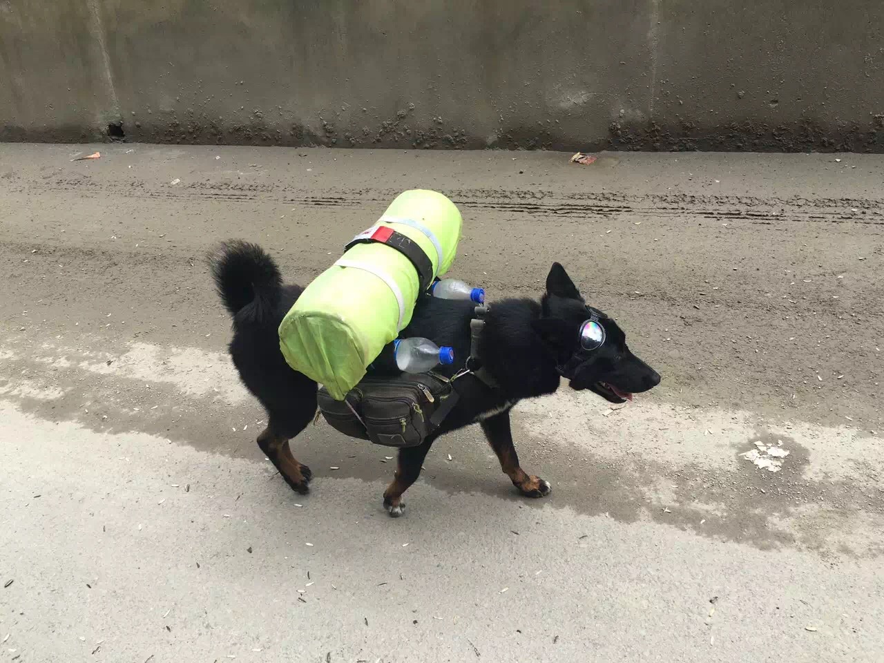 川藏线上什么人你都能遇到,有轮滑的,有牵着小狗的,可小狗帮忙背东西的你不一定遇得到。